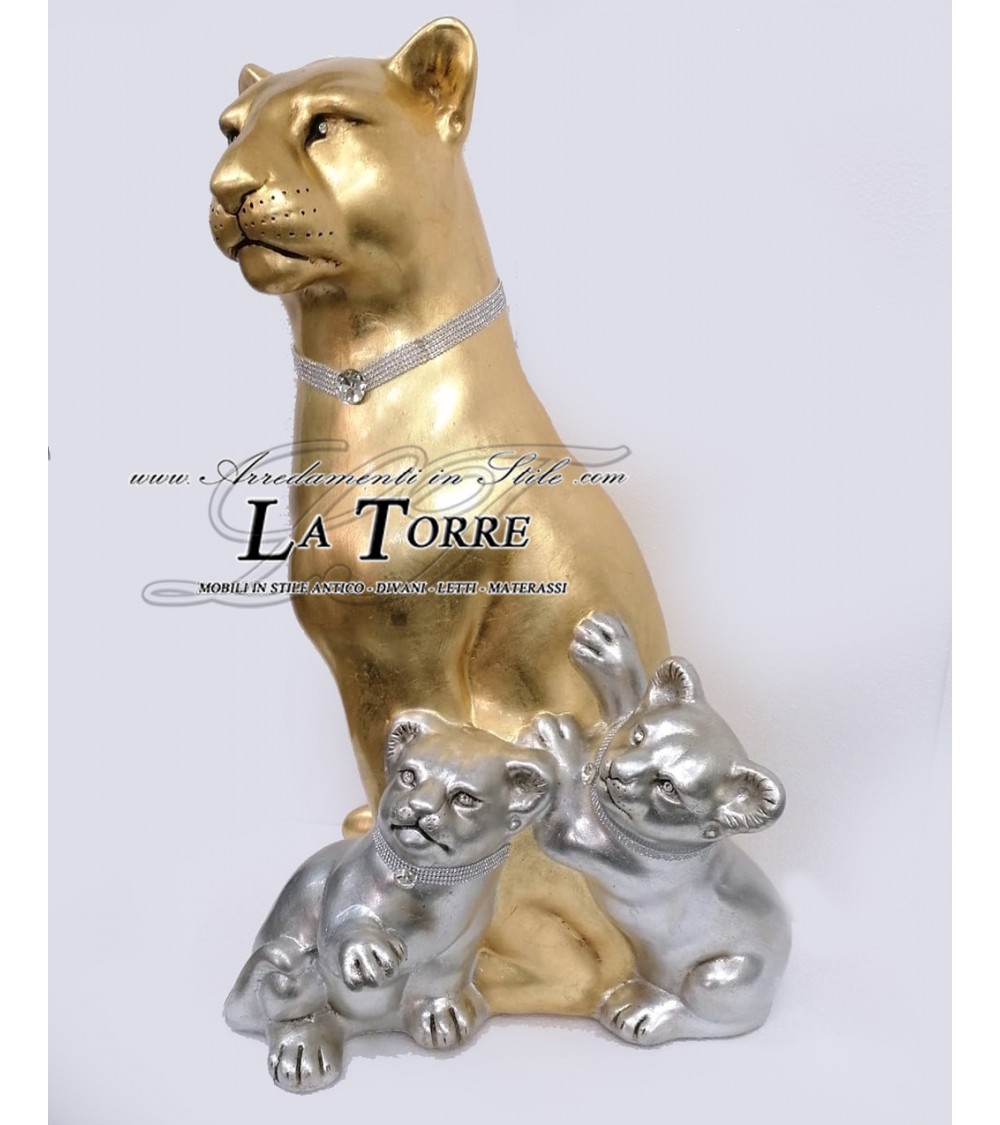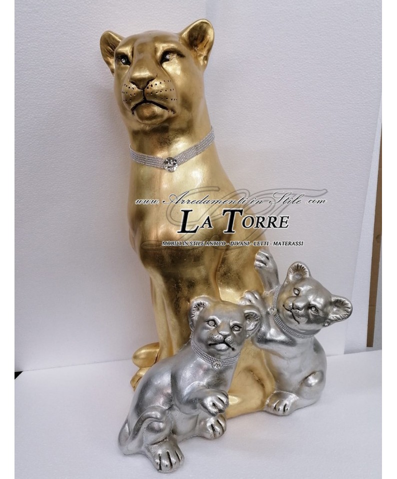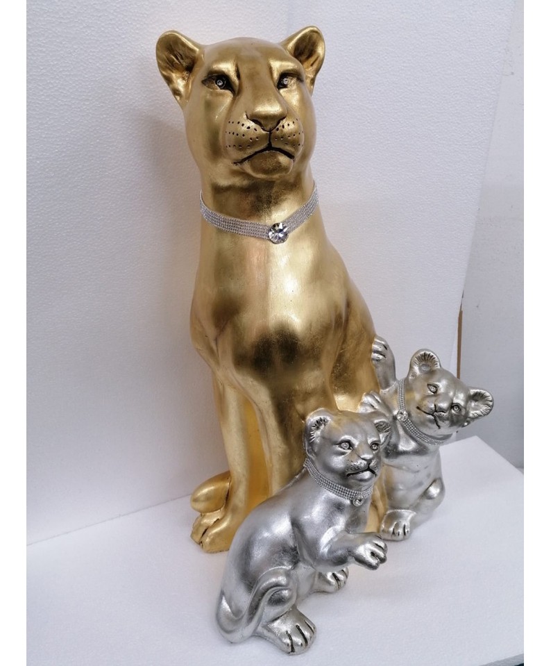 Leonessa in ceramica oro e cuccioli argento swarovski. La sua figura slanciata è accentuata da un elegante collare di strass brillanti, con un pendente centrale più grande che cattura la luce. Ai piedi della figura adulta, due cuccioli sono rappresentati in un gioco affettuoso. Entrambi i cuccioli sono realizzati in una finitura argentata lucida, creando un contrasto cromatico con la madre dorata. Uno dei cuccioli è seduto in primo piano, mentre l'altro sembra protendersi verso il primo in un gesto giocoso, entrambi con piccoli dettagli come collari di strass che richiamano quello della madre. L'intera composizione suggerisce un tema di eleganza, famiglia e maestosità, ed è chiaramente pensata come un elemento d'arredo di prestigio.