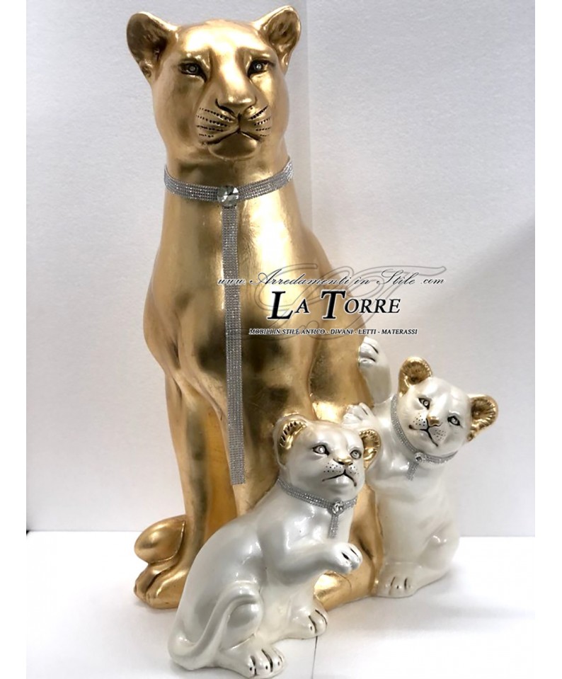 Leonessa in ceramica oro e cuccioli bianco perlato swarovski. La sua figura slanciata è accentuata da un elegante collare di strass brillanti, con un pendente centrale più grande che cattura la luce. Ai piedi della figura adulta, due cuccioli sono rappresentati in un gioco affettuoso. Entrambi i cuccioli sono realizzati in una finitura bianco perlato lucida, creando un contrasto cromatico con la madre dorata. Uno dei cuccioli è seduto in primo piano, mentre l'altro sembra protendersi verso il primo in un gesto giocoso, entrambi con piccoli dettagli come collari di strass che richiamano quello della madre. L'intera composizione suggerisce un tema di eleganza, famiglia e maestosità, ed è chiaramente pensata come un elemento d'arredo di prestigio.