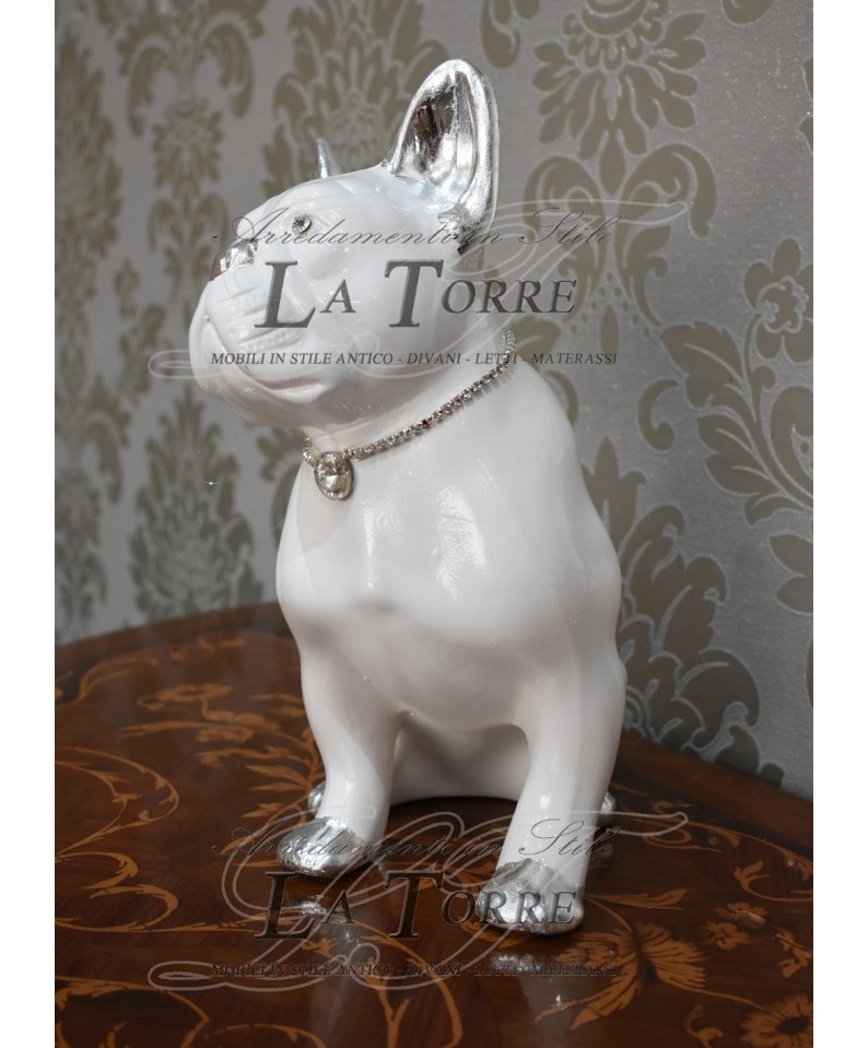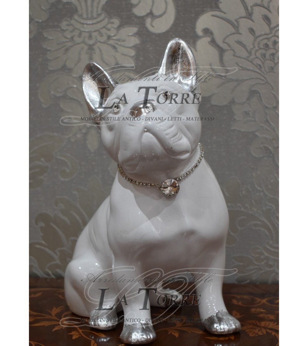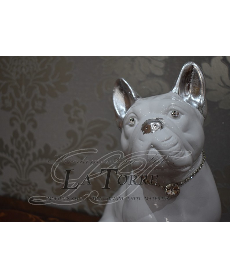 Animali in ceramica statua scultura cucciolo cane bulldog francese bianco argento swarovski h30cm PR09