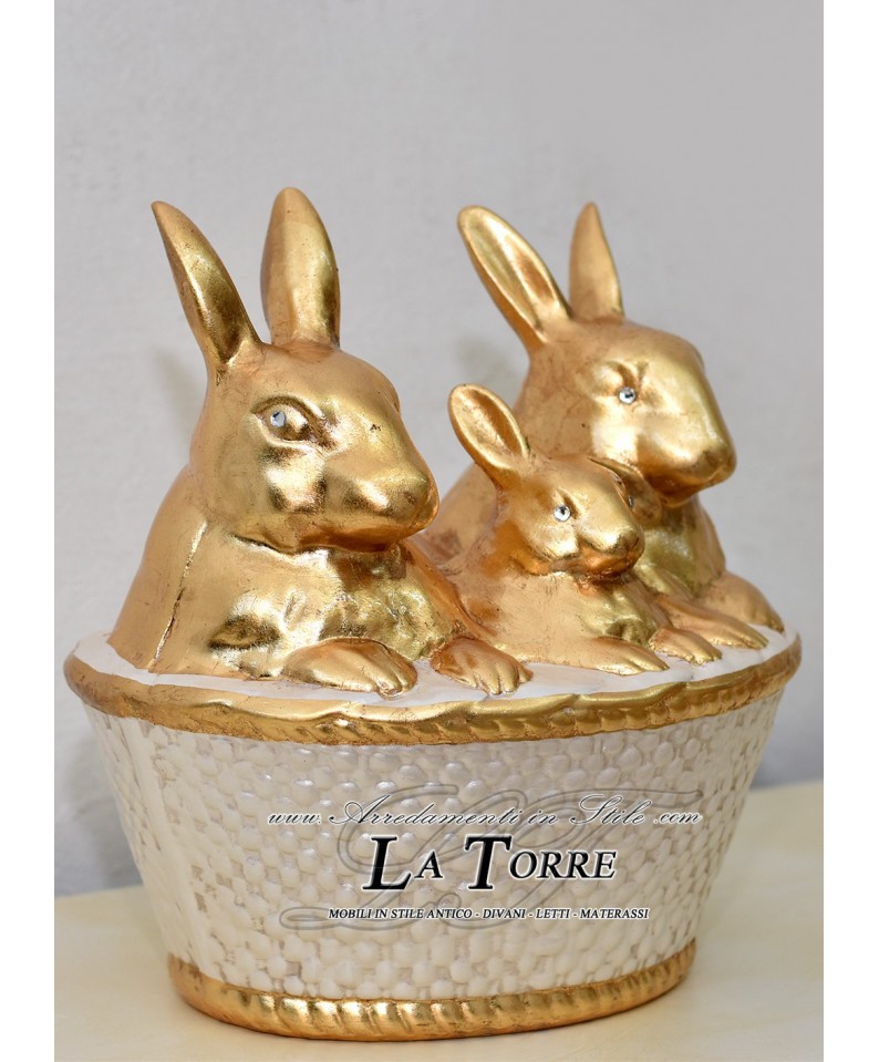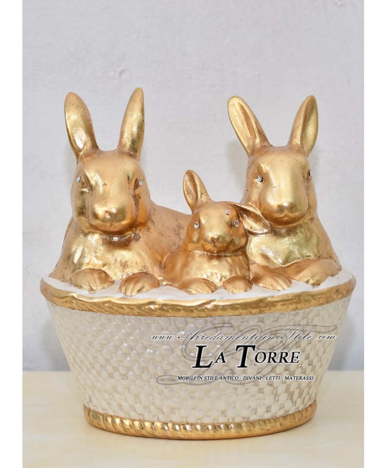 Statua scultura decorativa raffigurante una famiglia di conigli: due adulti e un cucciolo interamente in ceramica . Le sculture hanno una finitura in foglia oro e avorio, con occhi impreziositi da strass. Poggiano all'interno di un cesto con una finitura avorio e un effetto "craquelé" crepato, e un bordo dorato. È un pezzo d'arredo che combina un tema tenero e festoso con un'estetica lussuosa.
