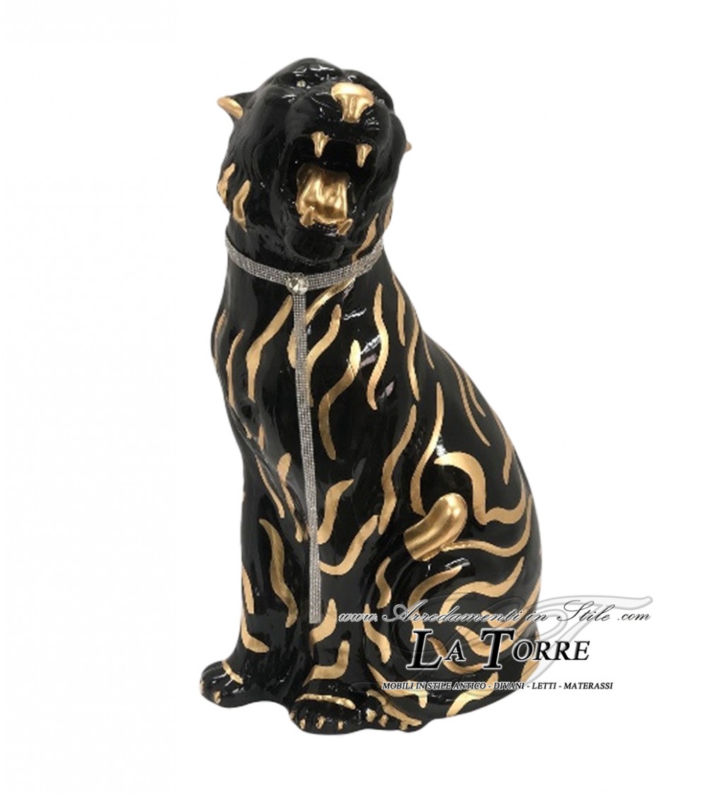 Animali in ceramica statua scultura Tigre bocca aperta nera e oro swarovski 90 cm PR03