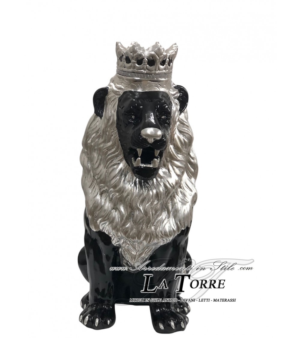 Animali in ceramica statua scultura Leone corona bocca aperta nero foglia argento 90 cm PR05
