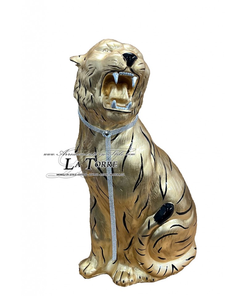 Tigre bocca aperta in ceramica, realizzata in ceramica oro con particolari in nero. La figura della tigre è rappresentata in una posa dinamica, quasi in procinto di ruggire, con la bocca aperta e i denti ben visibili, esprimendo forza e selvaggia maestosità. Le striature tipiche del manto della tigre sono stilizzate e realizzate in una finitura nera brillante, creando un netto contrasto con la foglia oro del corpo e conferendo un tocco moderno ed elegante all'opera. Al collo, la tigre indossa un vistoso collare di strass luminosi, con un pendente centrale che aggiunge un ulteriore elemento di lusso e brillantezza.