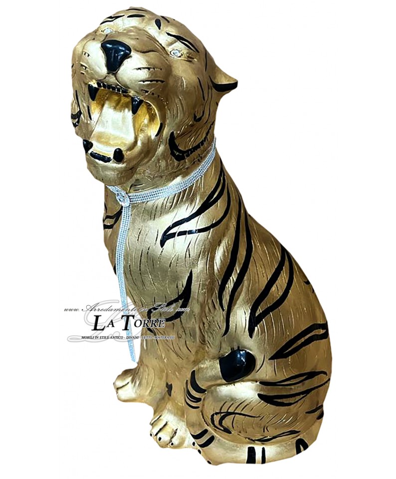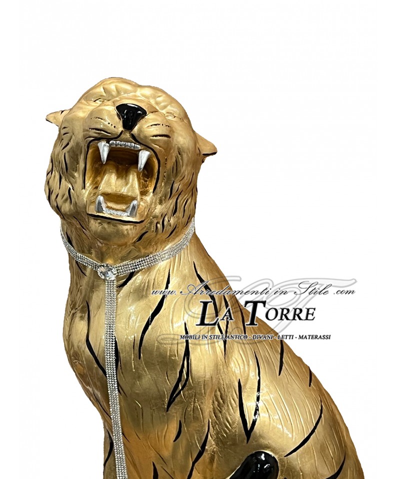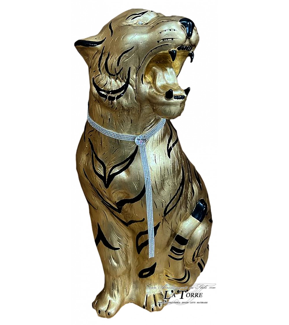 Animali in ceramica statua scultura Tigre bocca aperta foglia oro strisce nere swarovski 90 cm PR03