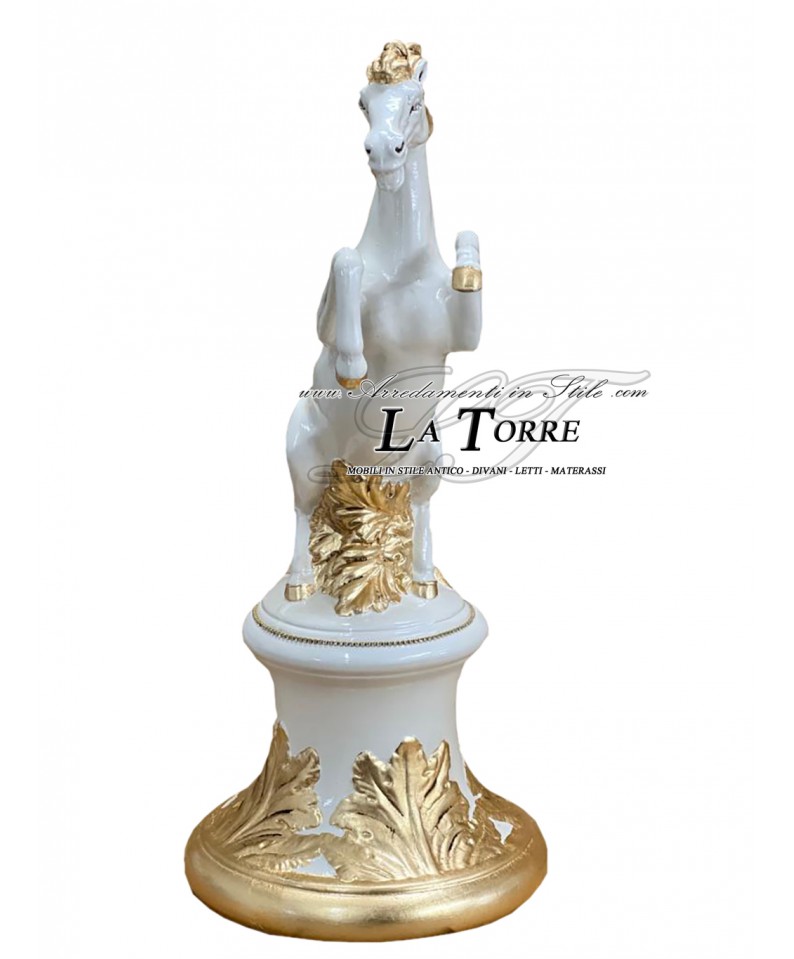 Statua scultura in ceramica cavallo rampante su un piedistallo. La statua ha una finitura bianca lucida e smaltata, mentre la criniera, la coda e gli zoccoli sono rifiniti in un brillante color oro. Il cavallo poggia su un piedistallo bianco decorato con motivi a foglie e bordi dorati. È un pezzo d'arredo elegante e di grande impatto visivo, che evoca un senso di forza e nobiltà.