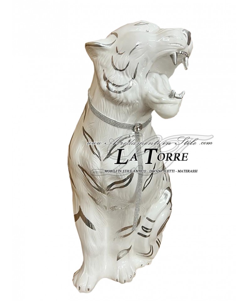 Tigre bocca aperta in ceramica, realizzata in ceramica bianca con particolari in oro. La figura della tigre è rappresentata in una posa dinamica, quasi in procinto di ruggire, con la bocca aperta e i denti ben visibili, esprimendo forza e selvaggia maestosità. Le striature tipiche del manto della tigre sono stilizzate e realizzate in una finitura oro brillante, creando un netto contrasto con il bianco lucido del corpo e conferendo un tocco moderno ed elegante all'opera. Al collo, la tigre indossa un vistoso collare di strass luminosi, con un pendente centrale che aggiunge un ulteriore elemento di lusso e brillantezza.