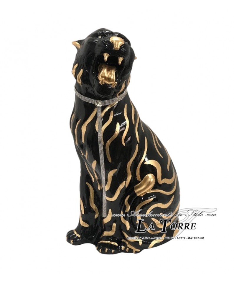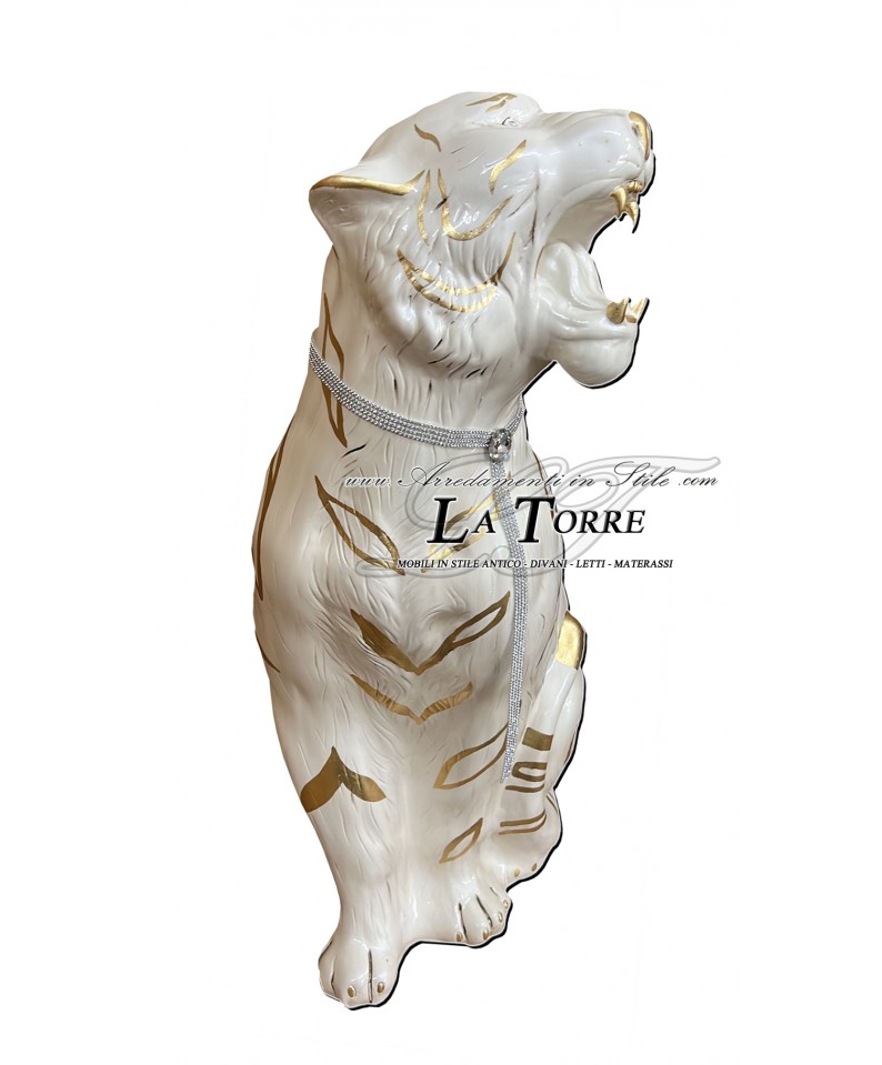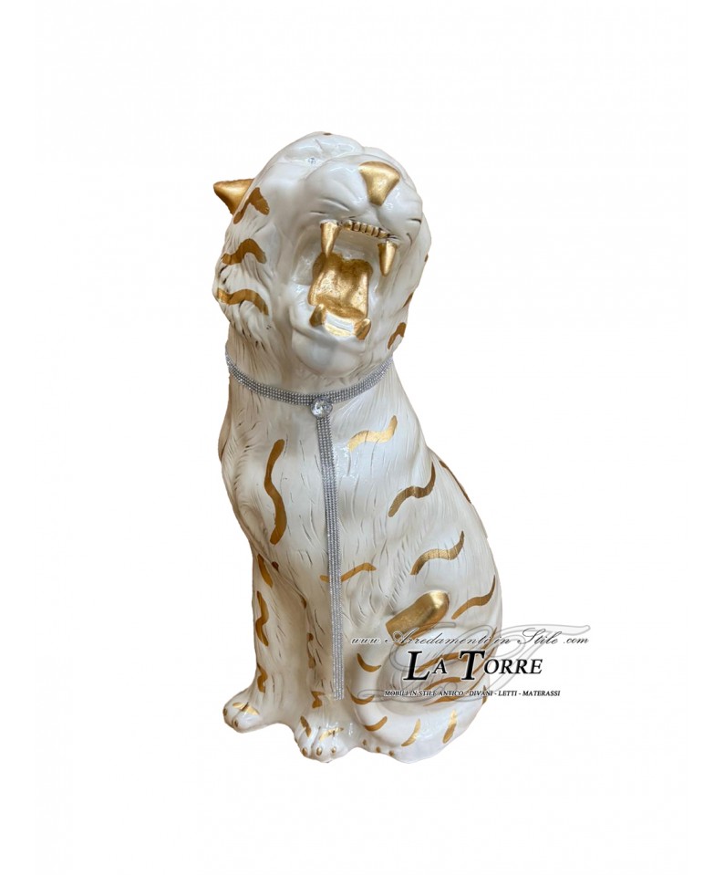 Animali in ceramica statua scultura Tigre bocca aperta bianca oro swarovski 90 cm PR03