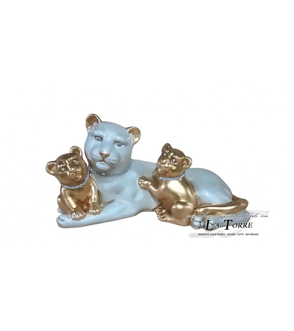 Statua pantera , con una madre sdraiata e due cuccioli. La madre e uno dei cuccioli sono in una finitura in bianco perlato metallica lucida, mentre i cuccioli in foglia oro metallico. Gli occhi della madre sono impreziositi da strass e indossa un sottile collare di cristalli. È un pezzo d'arredo che combina un tema tenero con un'estetica lussuosa.