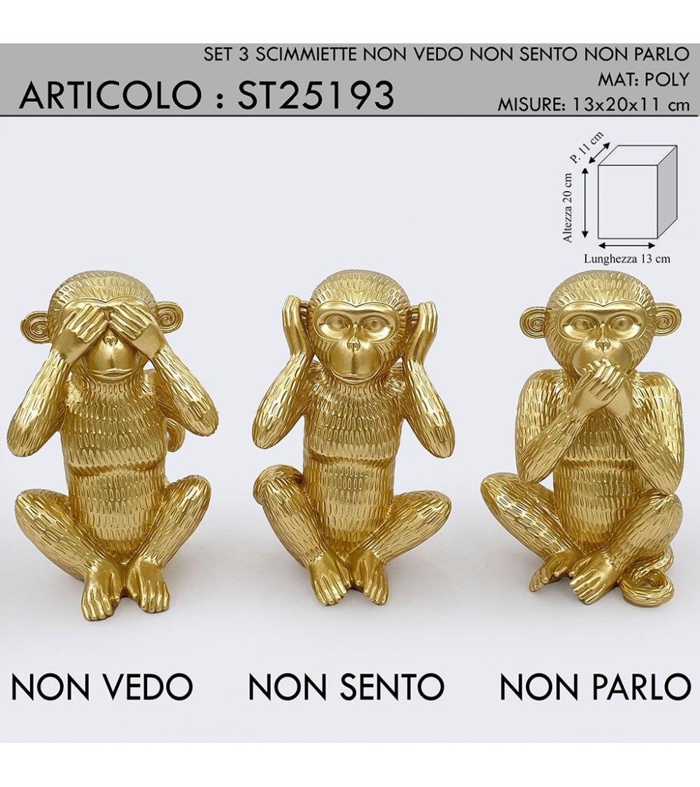 Statua scultura soprammobile tre scimmie scimmiette Non vedo Non sento Non parlo oro H 20 cm ST25193