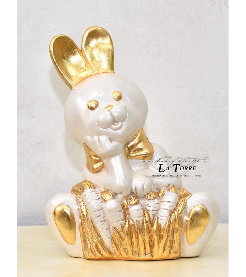 Statua scultura cucciolo coniglietto bianco perlato oro in ceramica, seduto su una fila di carote. Il corpo del coniglio ha una finitura bianca perlata e lucida. Le lunghe orecchie, il fiocco e i dettagli sul muso sono rifiniti in una lucida foglia oro . Anche le carote su cui poggia sono dorate. La statua ha un aspetto grazioso e lussuoso, ideale per un arredo primaverile o in stile country chic.