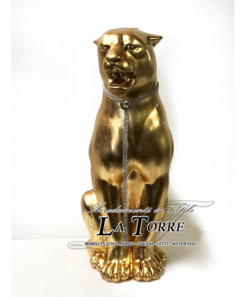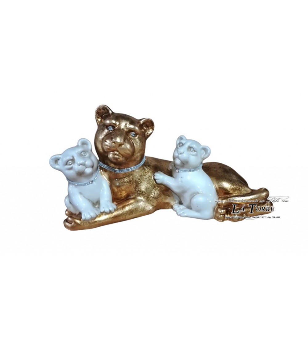 Statua pantera , con una madre sdraiata e due cuccioli. La madre e uno dei cuccioli sono in una finitura in foglia oro metallica lucida, mentre i cuccioli in bianco perlato metallico. Gli occhi della madre sono impreziositi da strass e indossa un sottile collare di cristalli. È un pezzo d'arredo che combina un tema tenero con un'estetica lussuosa.