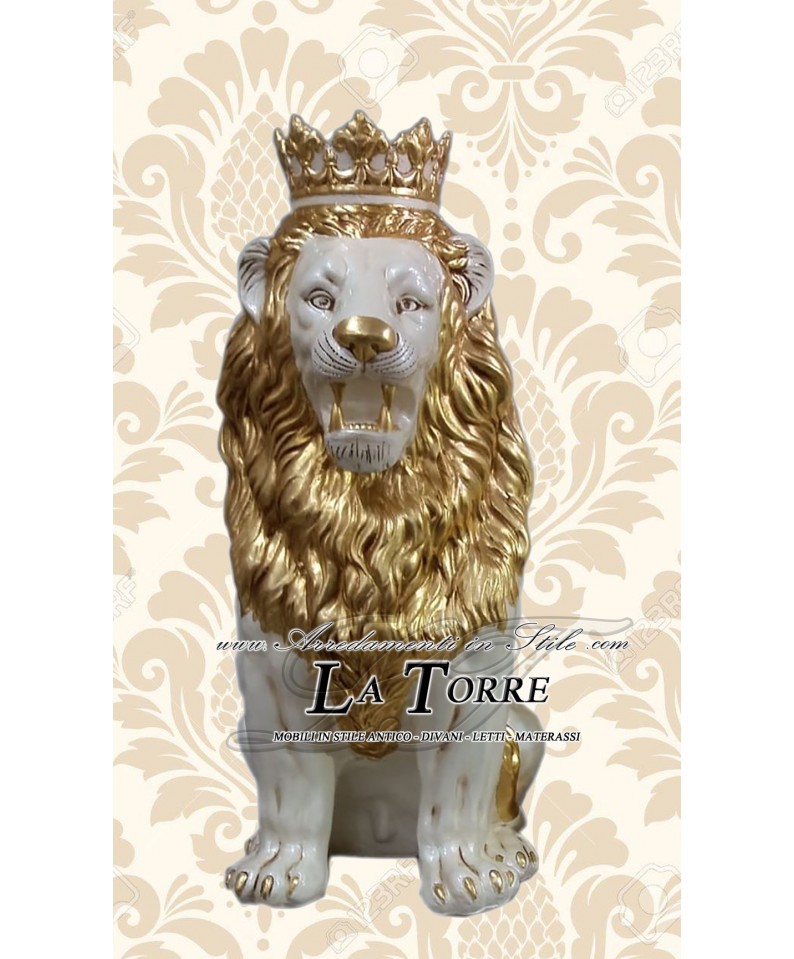 Leone corona bocca aperta e zampetta alzata avorio foglia oro in ceramica, seduto in posizione eretta, che incarna un senso di regalità e potenza. Il corpo del leone è realizzato in un bianco candido e lucido, mentre la folta criniera è splendidamente dorata, creando un contrasto visivo sorprendente e lussuoso. Il muso del leone presenta dettagli in oro su naso e parte della bocca, e la sua espressione è intensa e fiera, con la bocca leggermente aperta a mostrare i denti, evocando un ruggito silente ma imponente. Gli occhi sono scuri e penetranti, conferendo profondità al suo sguardo. In cima alla sua testa, il leone indossa una corona dorata riccamente scolpita, che accentua ulteriormente il suo status regale. Le zampe e le unghie sono anch'esse delineate con dettagli dorati, aggiungendo un tocco finale di opulenza.