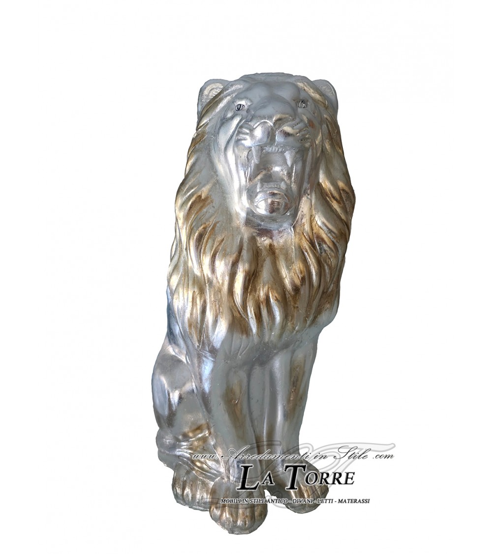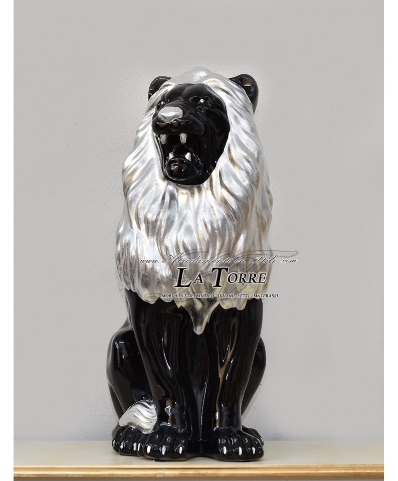 Leone corona bocca aperta in foglia argento in ceramica, seduto in posizione eretta, che incarna un senso di regalità e potenza. Il corpo del leone è realizzato in foglia argento, mentre la folta criniera è splendidamente brunita, creando un contrasto visivo sorprendente e lussuoso. Il muso del leone presenta dettagli in argento su naso e parte della bocca, e la sua espressione è intensa e fiera, con la bocca leggermente aperta a mostrare i denti, evocando un ruggito silente ma imponente. Gli occhi sono scuri e penetranti, conferendo profondità al suo sguardo. Le zampe e le unghie sono anch'esse delineate con dettagli dorati, aggiungendo un tocco finale di opulenza.