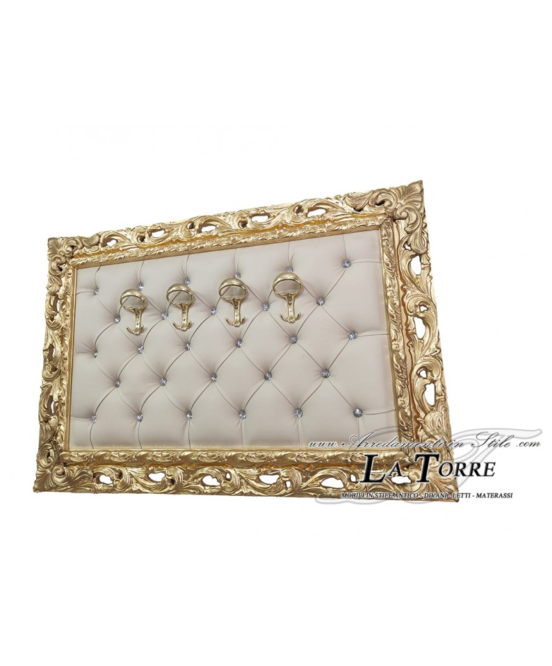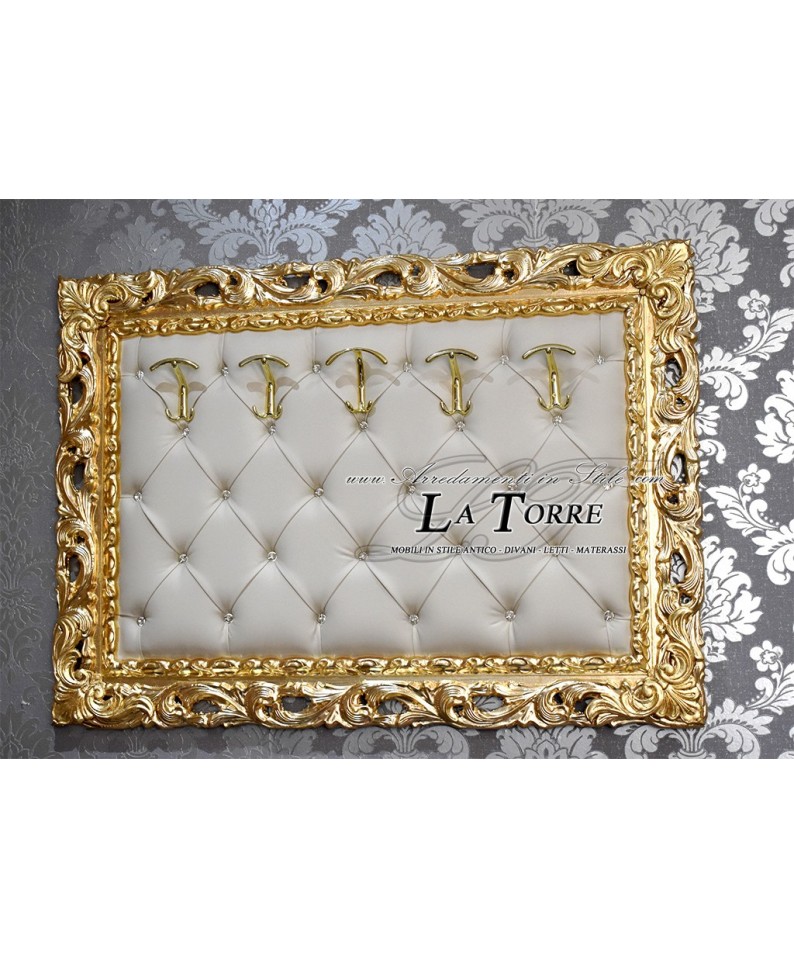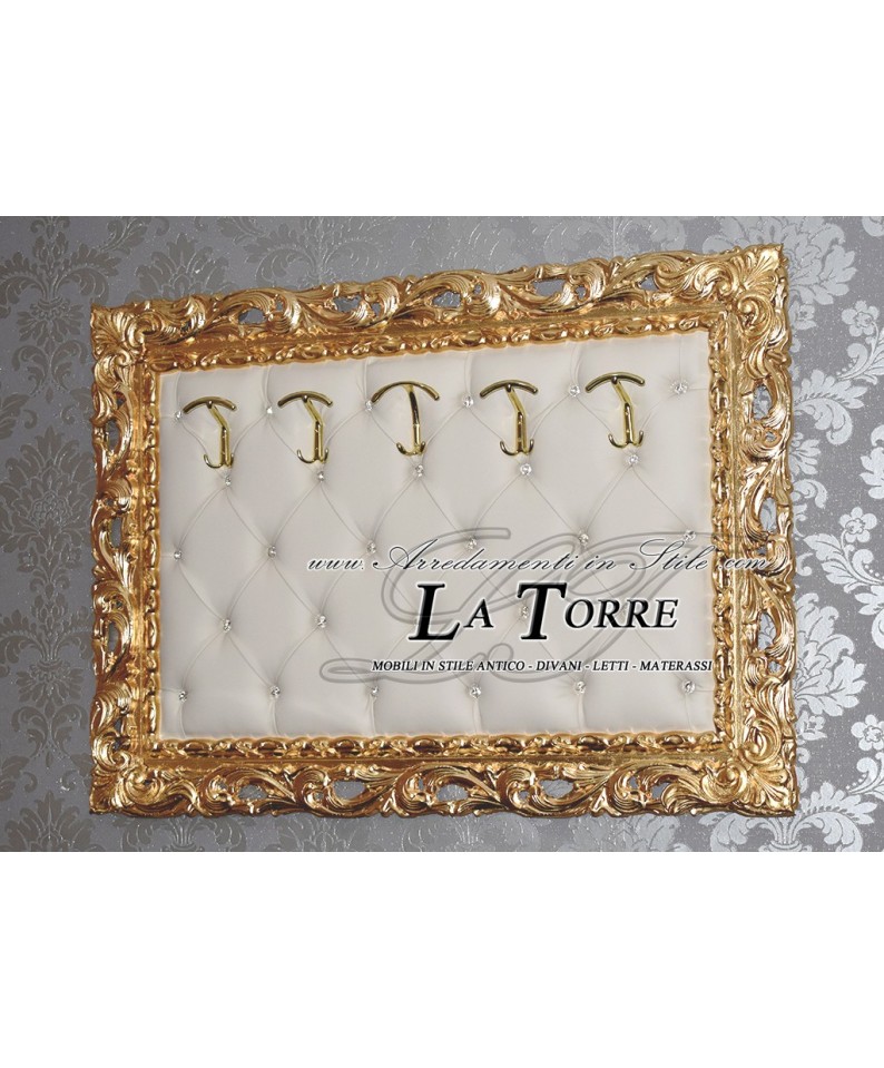 La cornice dell'appendiabiti è realizzata in legno in foglia oro, con intagli elaborati e decorazioni floreali che richiamano lo stile barocco. Quattro ganci in metallo dorato, con una forma a ricciolo, sono fissati sulla parte superiore dell'appendiabiti, offrendo spazio per appendere cappotti, sciarpe o altri accessori.