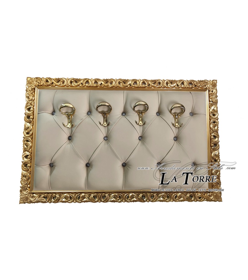 La cornice dell'appendiabiti è realizzata in legno in foglia oro , con intagli elaborati e decorazioni floreali che richiamano lo stile barocco. Quattro ganci in metallo argentato, con una forma a ricciolo, sono fissati sulla parte superiore dell'appendiabiti, offrendo spazio per appendere cappotti, sciarpe o altri accessori.