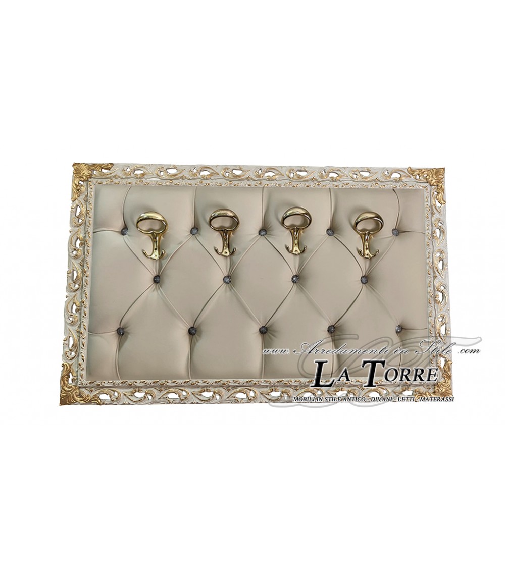 Appendiabiti da parete in stile barocco si distingue per il suo design lussuoso e decorativo. La struttura è interamente rivestita in ecopelle avorio trapuntato, con una lavorazione capitonné che crea un motivo a rombi, aggiungendo un tocco di eleganza e texture.