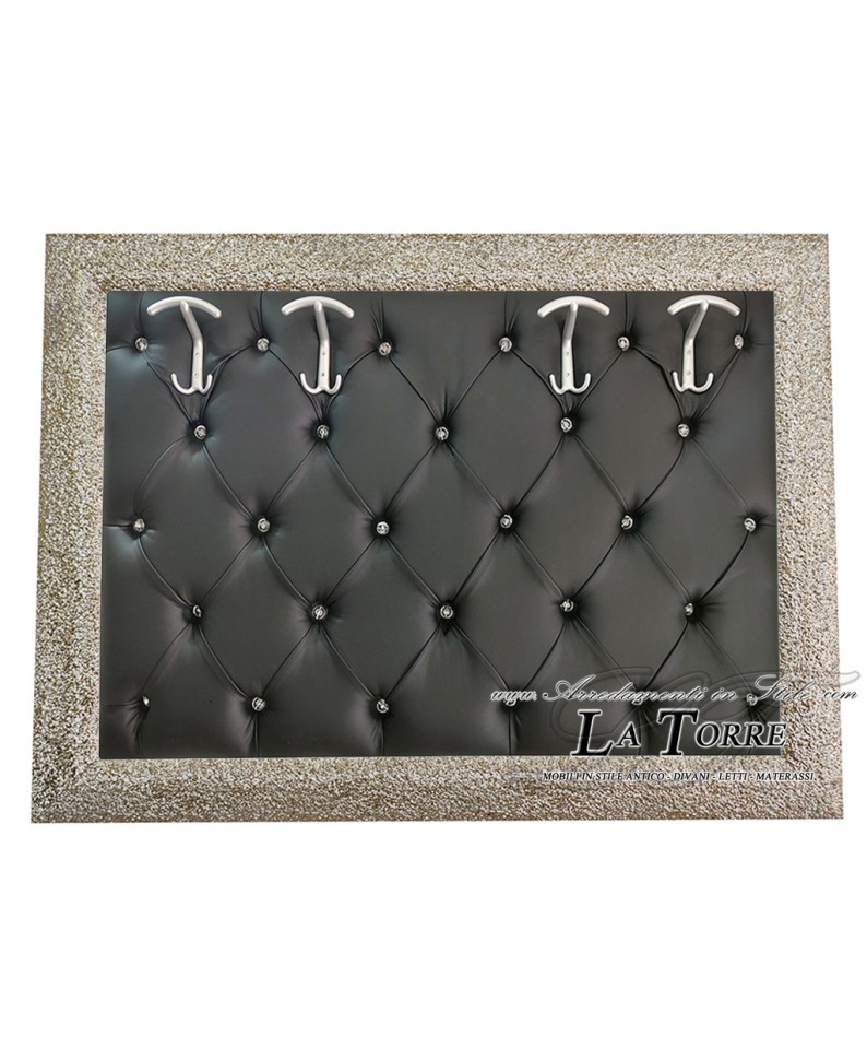 Appendiabiti da parete in stile barocco presenta un design raffinato e funzionale. La base è rivestita in un morbido tessuto ecopelle color nera, con una classica lavorazione capitonné che crea un motivo a rombi, impreziosito da bottoni che aggiungono un tocco di eleganza e texture.