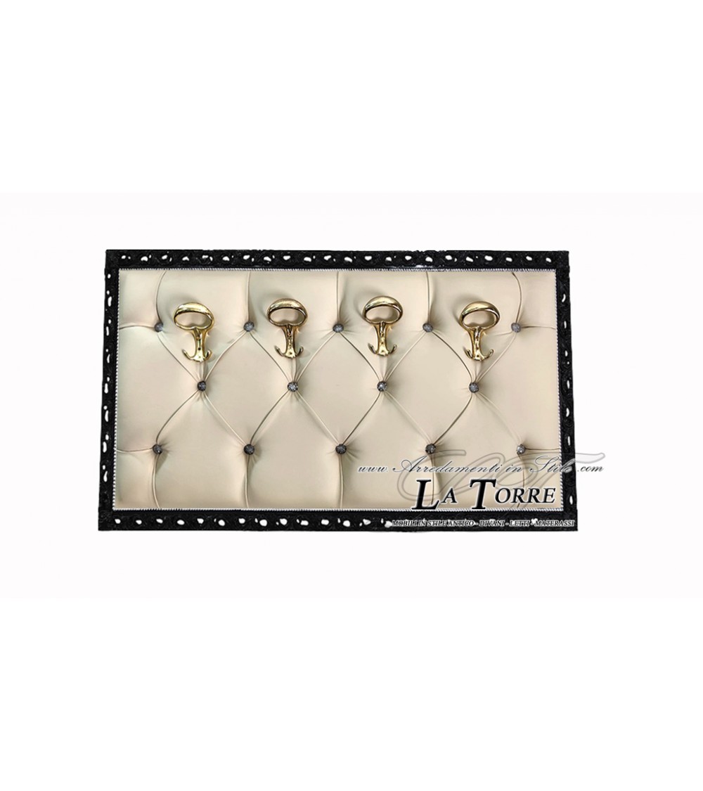 Appendiabiti da parete in stile barocco si distingue per il suo design lussuoso e decorativo. La struttura è interamente rivestita in ecopelle avorio trapuntato, con una lavorazione capitonné che crea un motivo a rombi, aggiungendo un tocco di eleganza e texture.