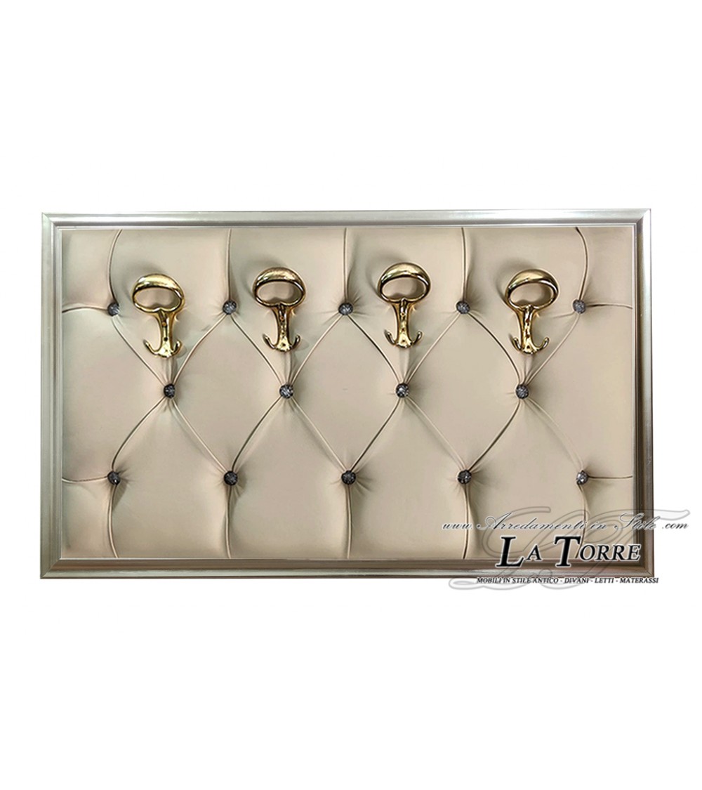 Appendiabiti da parete in stile barocco presenta un design sofisticato e funzionale. La base è rivestita in ecopelle avorio trapuntata, con una classica lavorazione capitonné che crea un motivo a rombi, impreziosito da bottoni che aggiungono un tocco di eleganza e texture.