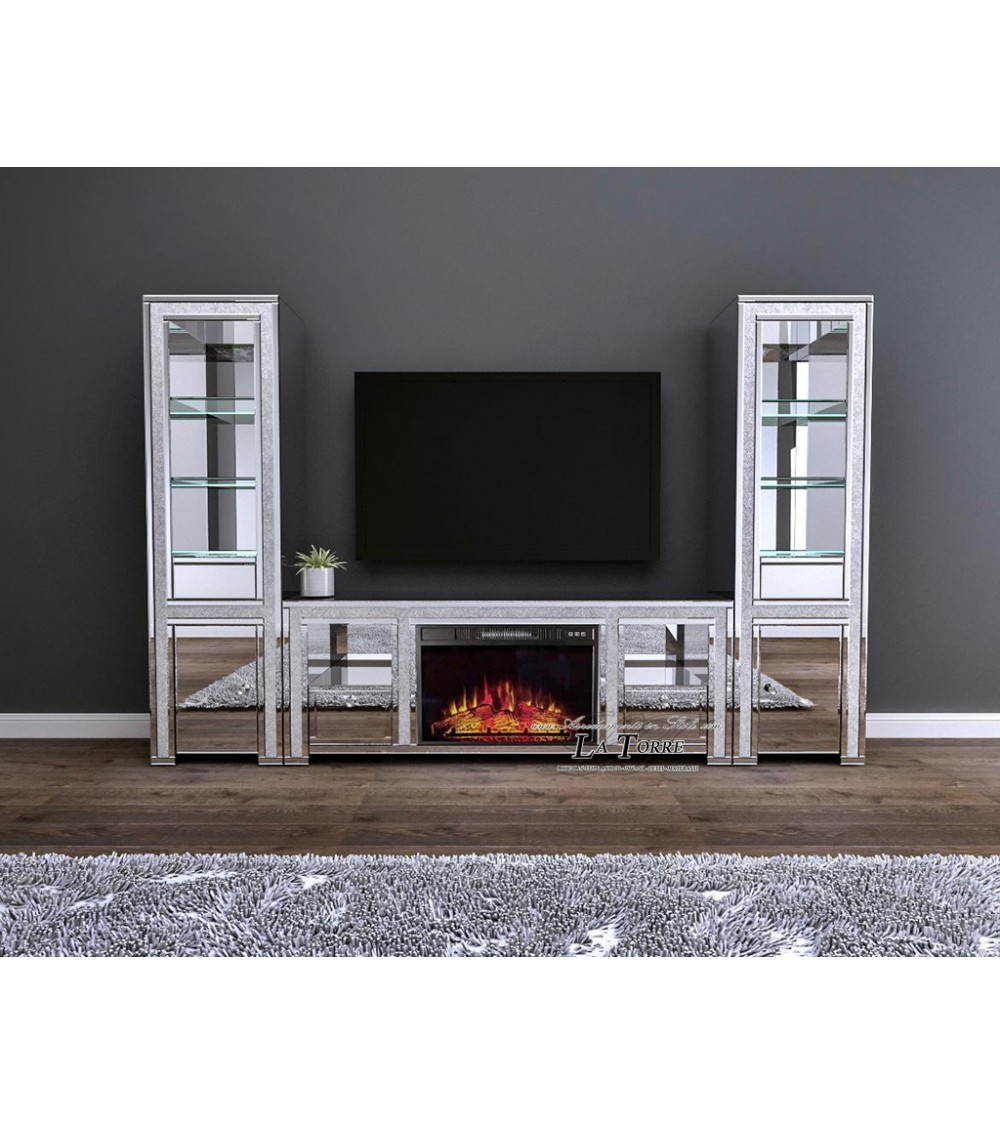 Elegante mobile porta TV completo di camino elettrico, ideale per arredare con stile il soggiorno. Struttura in specchio di alta qualità con dettagli raffinati e Swarovski incastonati, che donano luce e prestigio all'ambiente.