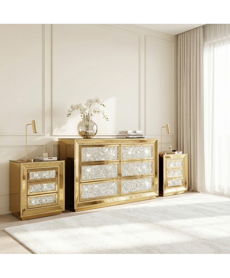 Comodino Specchiato con 3 Cassetti e Brillanti Swarovski – Design Moderno A1201