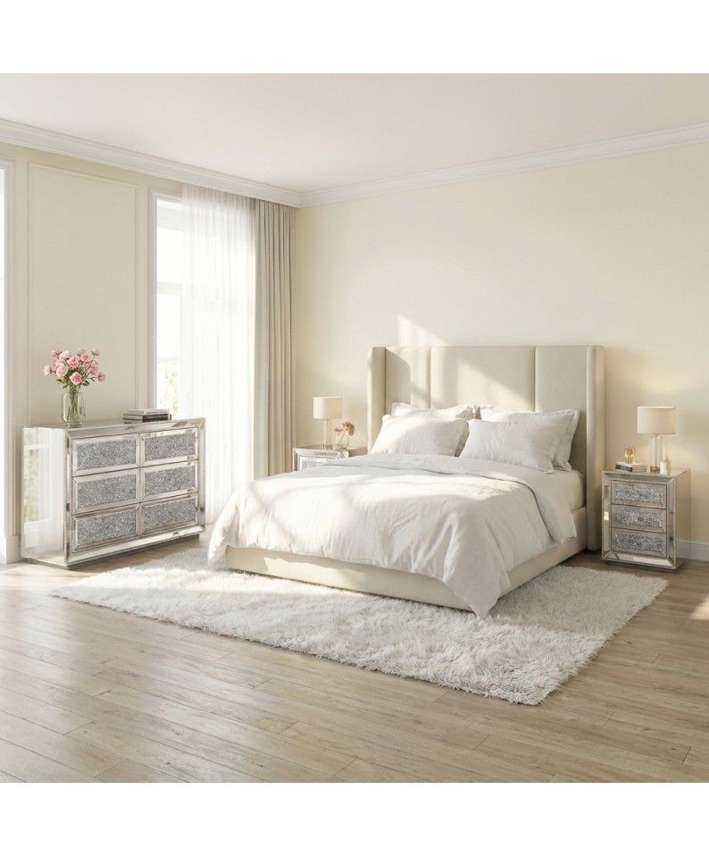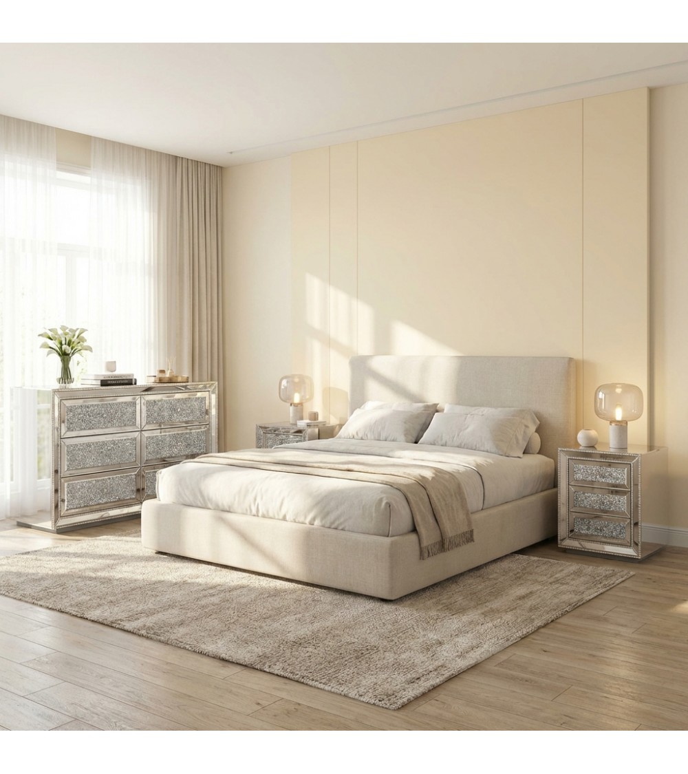 Il set camera CBFD16FMB è composto da un elegante comò con due comodini coordinati realizzati in finitura specchiata argento, progettati per arredare la camera da letto con uno stile moderno, luminoso e raffinato.