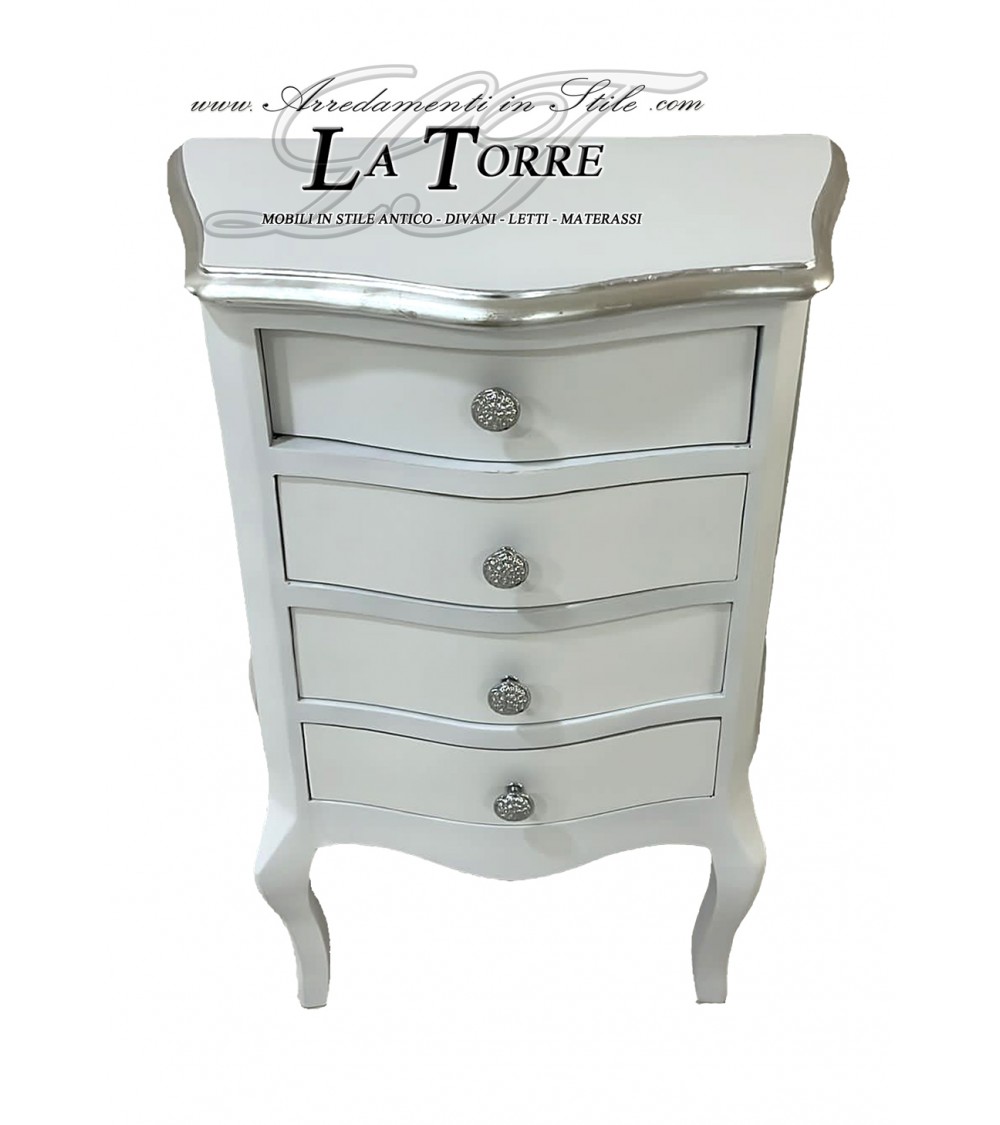 Comodino classico 4 cassetti in stile classico, realizzata in legno, laccata in bianco, che gli conferisce un aspetto fresco e moderno. Il piano superiore e i profili sagomati sono rifiniti con una finitura argentata, creando un contrasto sofisticato con la laccatura chiara. Il mobile presenta quattro cassetti frontali, ognuno con un leggero profilo bombato o curvo che ne esalta la morbidezza delle linee. Ogni cassetto è dotato di un pomello rotondo e decorato, anch'esso con finitura argentata, che aggiunge un tocco di raffinatezza. Ideale per una camera da letto in stile contemporaneo o classico.
