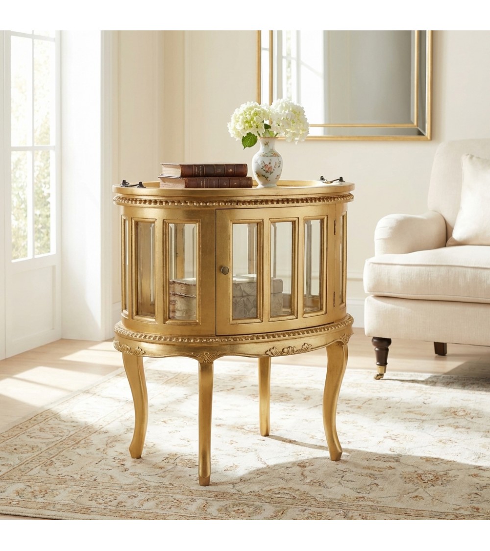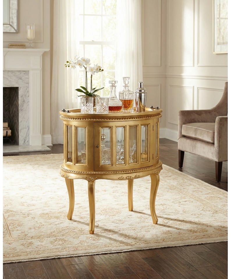 La struttura presenta linee sinuose e armoniose tipiche dello stile classico, impreziosite da ante con inserti in vetro che permettono di esporre bottiglie, bicchieri o oggetti decorativi con eleganza. Le maniglie e il pomello dorati valorizzano ulteriormente il mobile, mentre le gambe sagomate conferiscono leggerezza e raffinatezza al design.