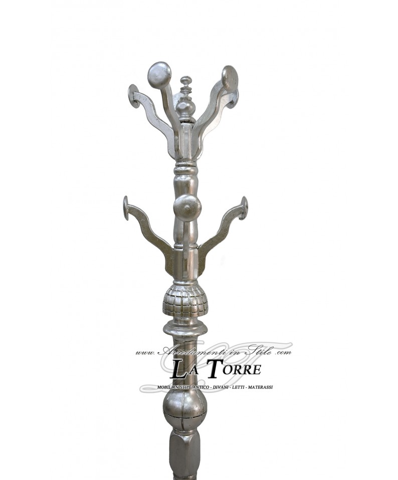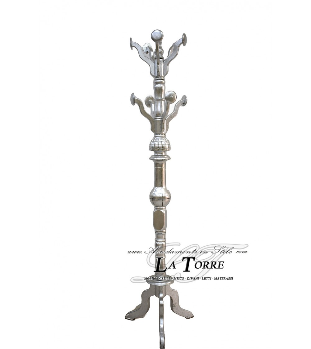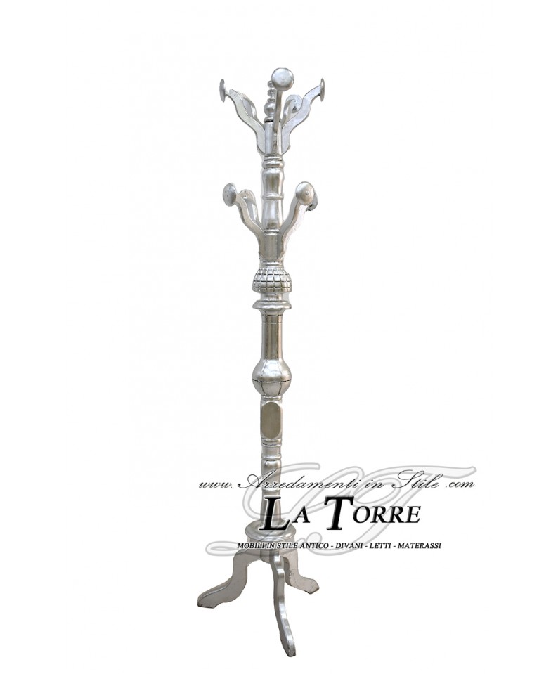 Elegante appendiabiti a stelo in stile classico, barocco , in legno massello in foglia argento. Presenta ganci e dettagli argentati su un fusto tornito e una base composta da tre gambe arcuate o a sciabola, che garantiscono stabilità, anch'esse argentate sui piedini. Un pezzo funzionale e raffinato ideale per un ingresso, uno studio o una camera da letto in stile classico, aggiungendo un tocco di raffinatezza e ordine all'ambiente.