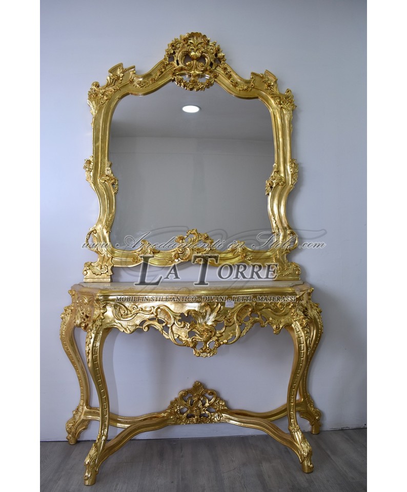 Set composto da una console e una specchiera abbinata, in puro stile barocco , caratterizzato da una finitura dorata. La specchiera è di dimensioni imponenti e presenta una cornice in legno massello interamente intagliata con una profusione di motivi decorativi tipici dello stile: riccioli, volute, foglie d'acanto e conchiglie. Sotto la specchiera si trova la console, che riprende fedelmente lo stile e gli intagli della cornice. La sua struttura è interamente dorata e scolpita, con gambe elegantemente curve la fascia sotto il piano è riccamente decorata al centro con un grande motivo a conchiglia e fogliame. Il piano della console è in marmo chiaro, probabilmente un avorio con venature sottili, che fornisce una superficie elegante e resistente.
