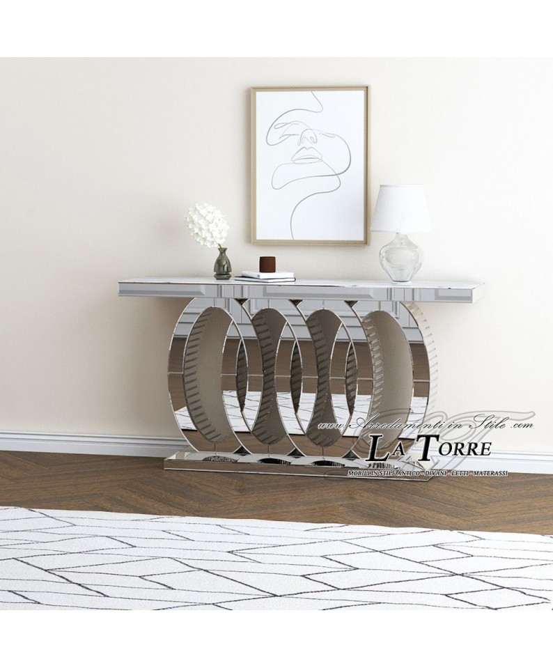 Aggiungi stile e prestigio alla tua casa con questa consolle specchiata moderna, impreziosita da dettagli Swarovski che riflettono la luce, creando un effetto scenografico di lusso e raffinatezza.