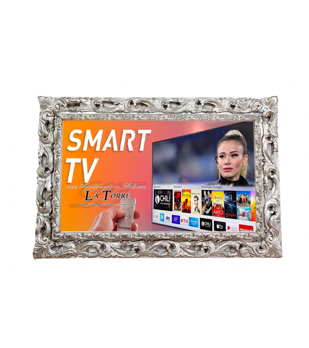 Cornice per Smart Tv a muro classica in stile barocco , con finitura in foglia argento, che presenta elaborate decorazioni che le conferiscono un aspetto barocco.