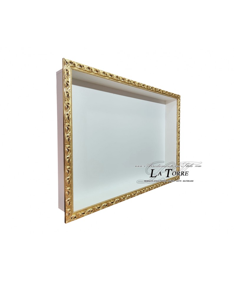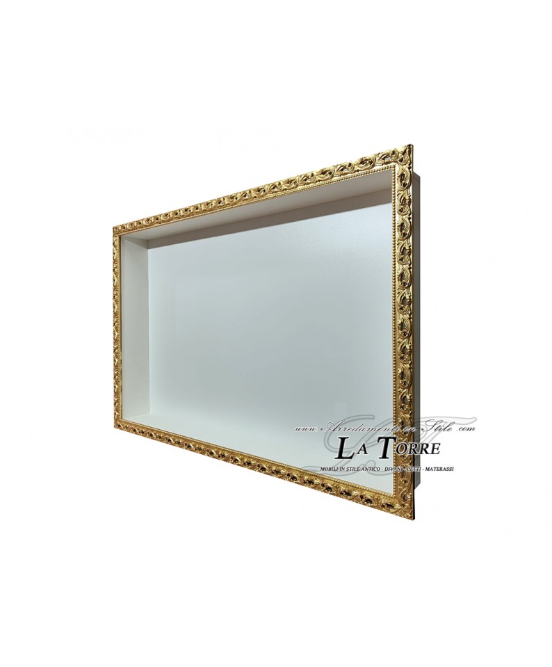 Mobile sospeso porta Smart TV , box su misura, da parete stile Barocco , con cornice traforata finemente lavorata e in foglia oro.