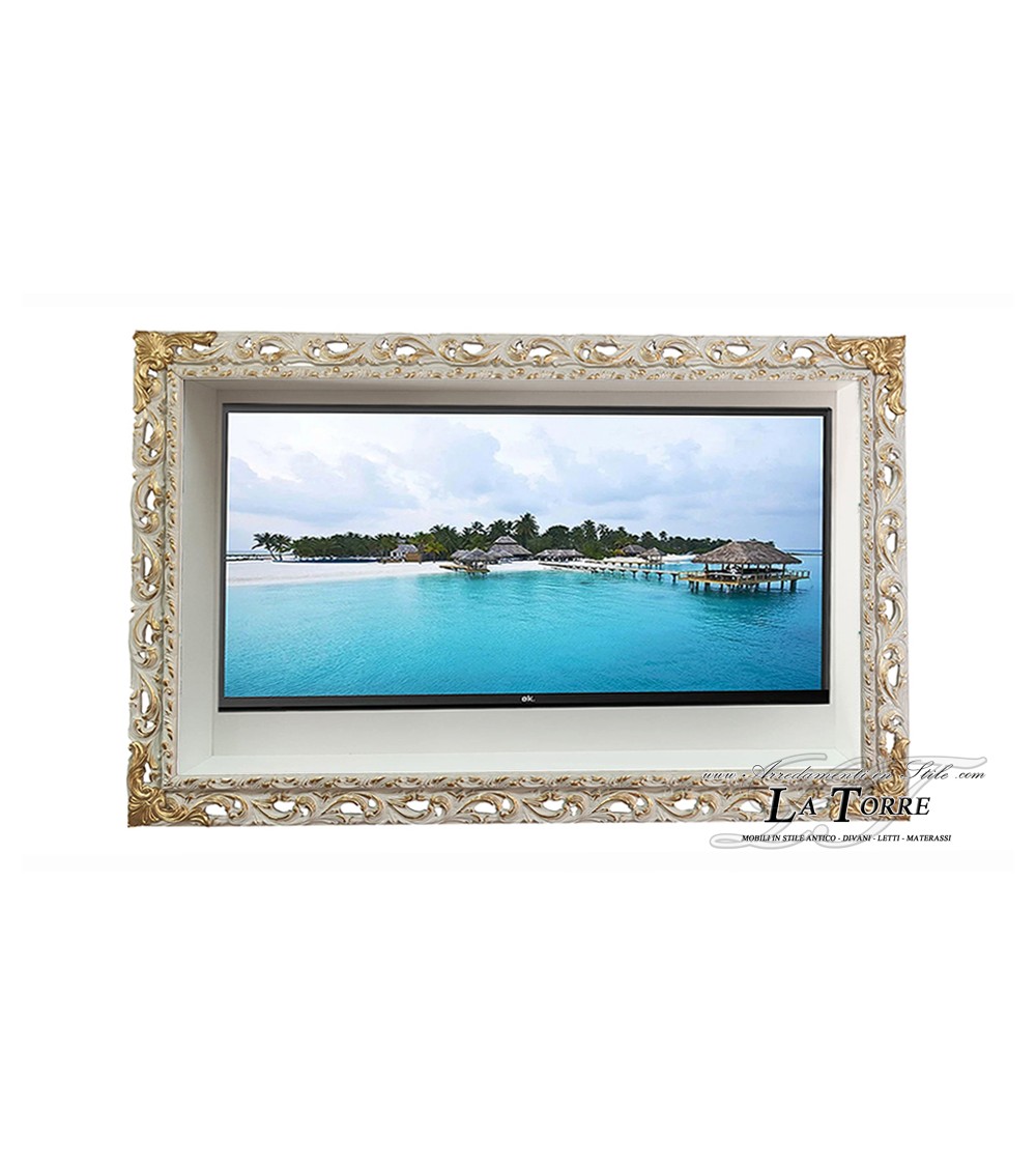 Mobile sospeso porta Smart TV con cornice traforata classica da parete stile Barocco box su misura GGAVox