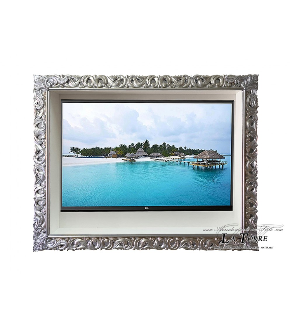 Mobile sospeso porta Smart TV , box su misura, da parete stile Barocco , con cornice argento traforata finemente lavorata e in argento.