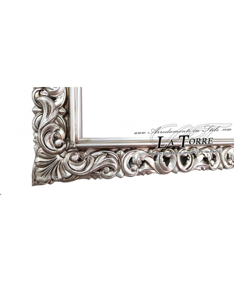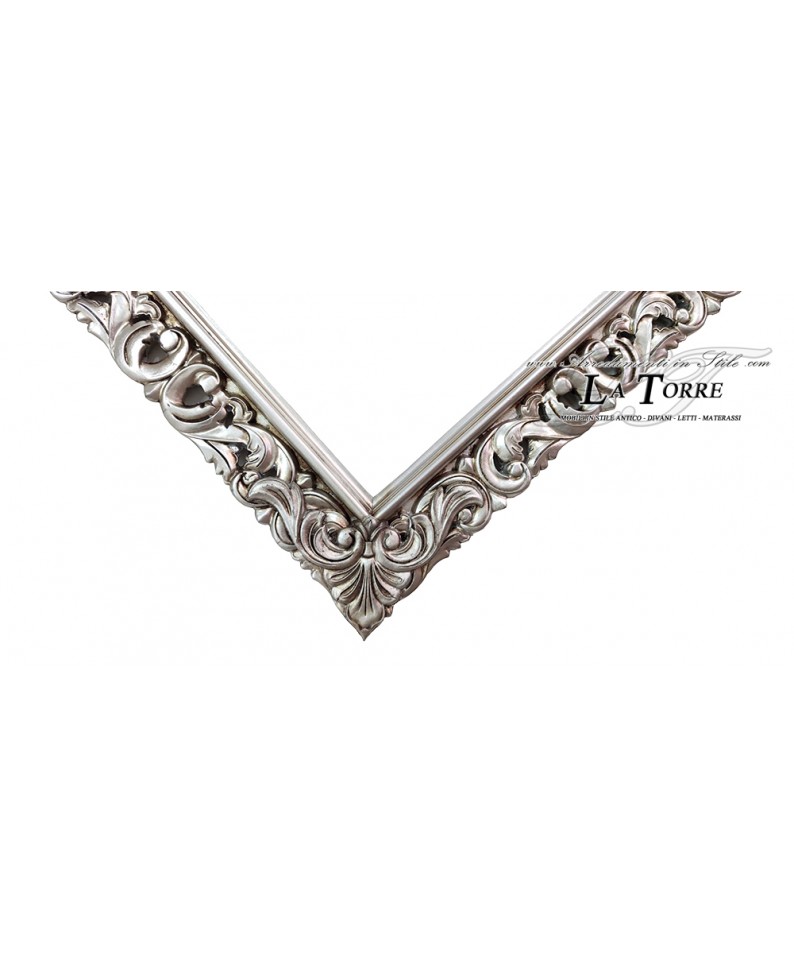 L'ampia fascia della cornice è decorata con un motivo continuo di volute sinuose ed elementi fogliacei, con la finitura in foglia argento che mette in risalto le texture del legno intagliato e donerebbe profondità all'aspetto complessivo. La tonalità argentata lucida,aggiunge un fascino intramontabile all'oggetto.