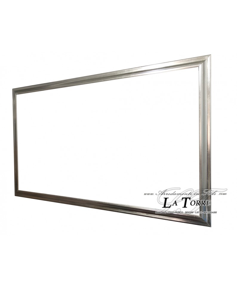 Cornice rettangolare che presenta uno stile classico ed elegante, con una finitura argentata lucida. La cornice è realizzata in legno e presenta una superficie liscia e uniforme, priva di intagli o decorazioni elaborate, tipiche invece dello stile barocco.