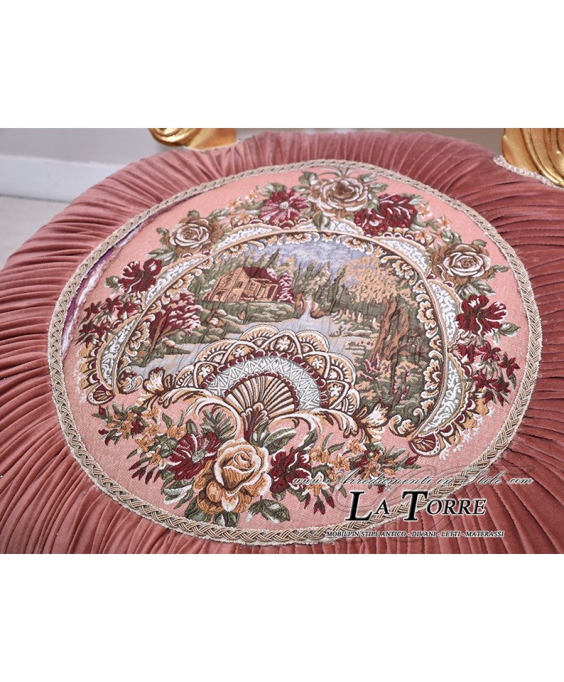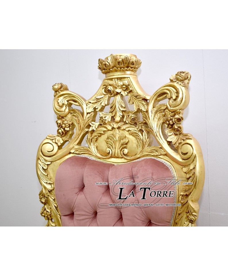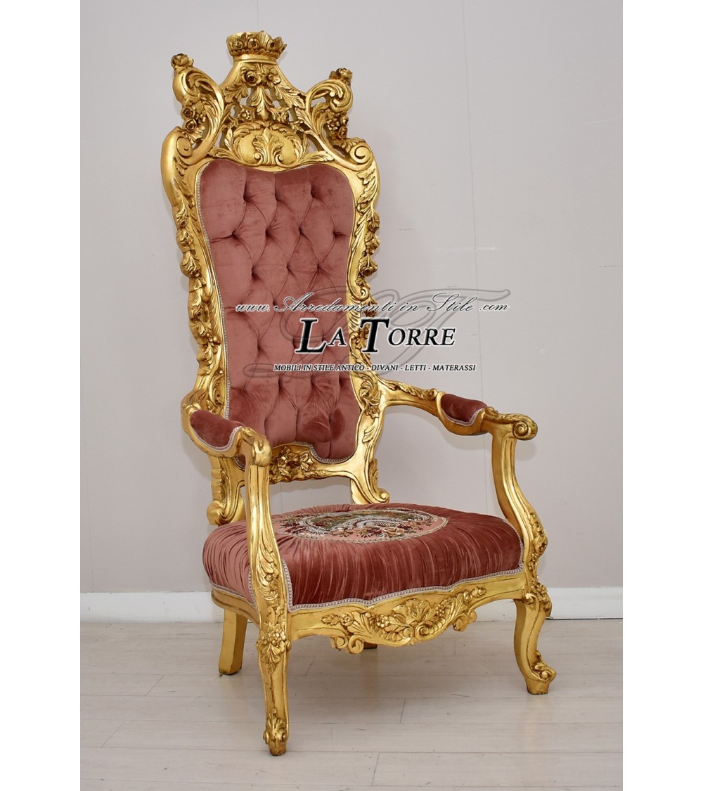 Sedia Poltrona Trono in stile barocco, con struttura interamente dorata e riccamente intagliata, inclusa una cimasa a forma di corona. Lo schienale altissimo sono rivestiti in velluto rosa antico capitonné con bottoni gioiello, la seduta sempre dello stesso colore, è caratterizzata da un disegno tipico arabesco con fiori e paesaggi. Un pezzo di estremo lusso e grande impatto scenografico, tipico dello stile barocco.