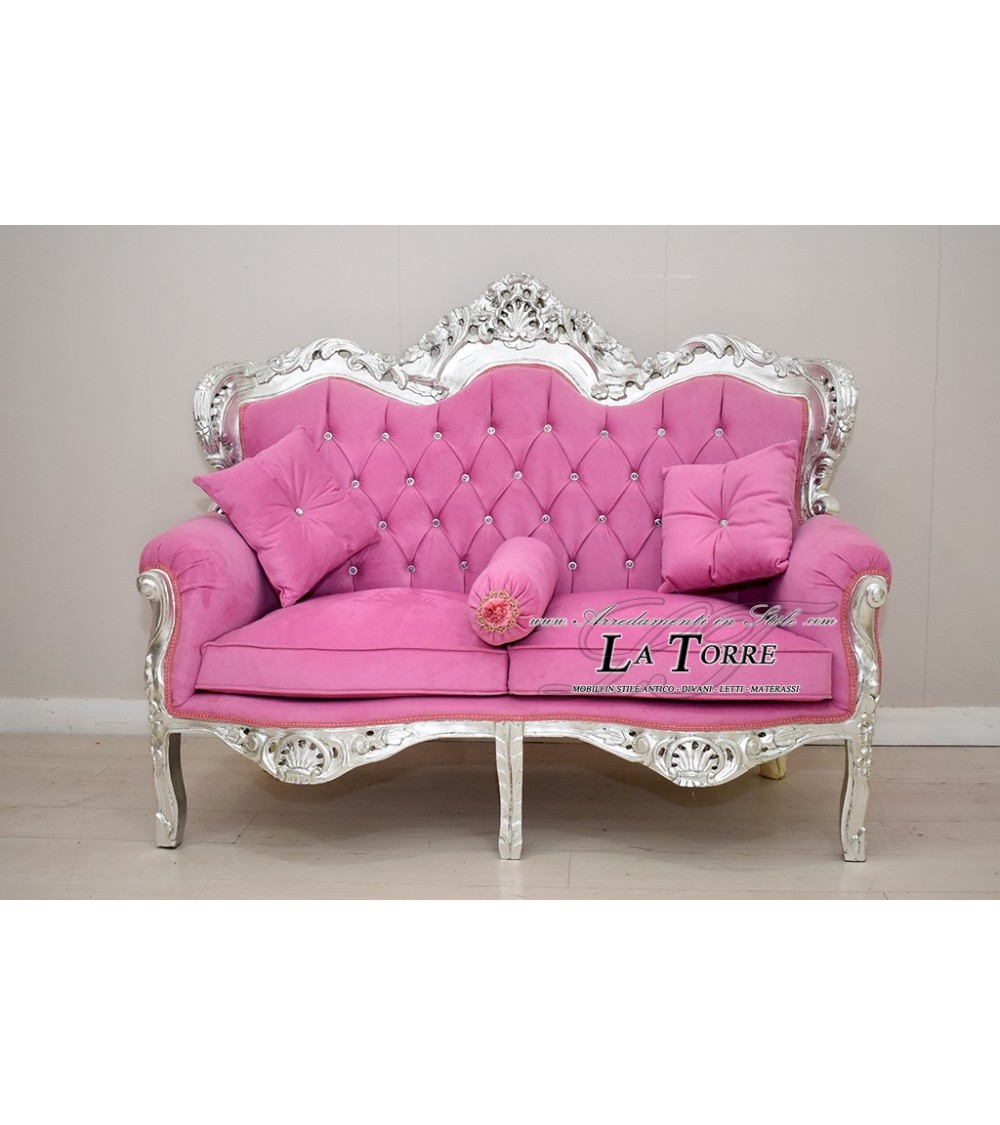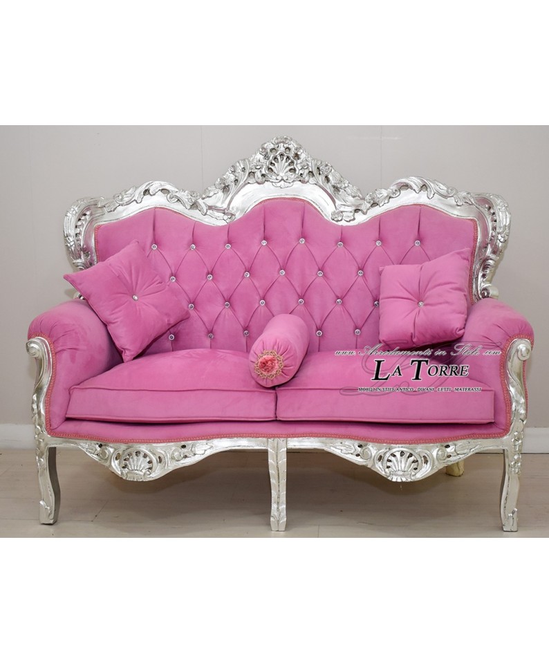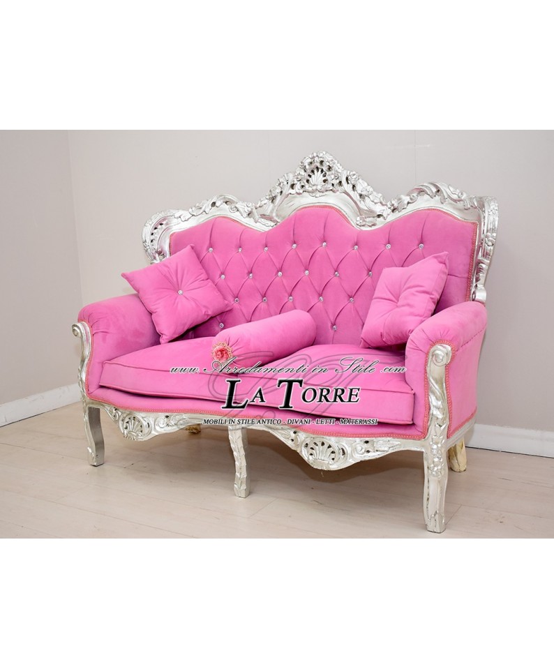 Divano Poltrona Germany Salotto con struttura esterna interamente realizzata in legno e ricoperta da foglia argento, che esalta ogni curva e intaglio. Lo schienale, sagomato a doppia gobba, è riccamente adornato da una cimasa centrale elaborata con motivi a conchiglia, volute e foglie d'acanto, e profili intagliati lungo tutto il perimetro, tipici dello stile sfarzoso. Il rivestimento è in velluto fucsia, mentre lo schienale è impreziosito da una profonda lavorazione capitonné, con bottoni in swarovski, che aggiungono brillantezza e un tocco glamour. La seduta è imbottita e presenta una superficie liscia. Questo divano è un pezzo di grande impatto visivo, ideale per arricchire un salotto formale, conferendo un'atmosfera di grandezza, sfarzo e raffinatezza.
