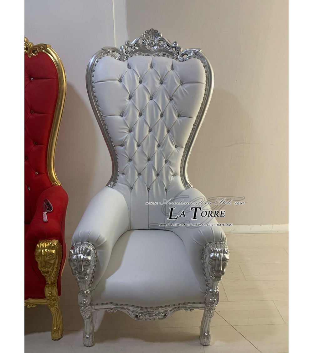 Sedia Poltrona Trono Barocco ecopelle o vellutino bianca argento MA1825