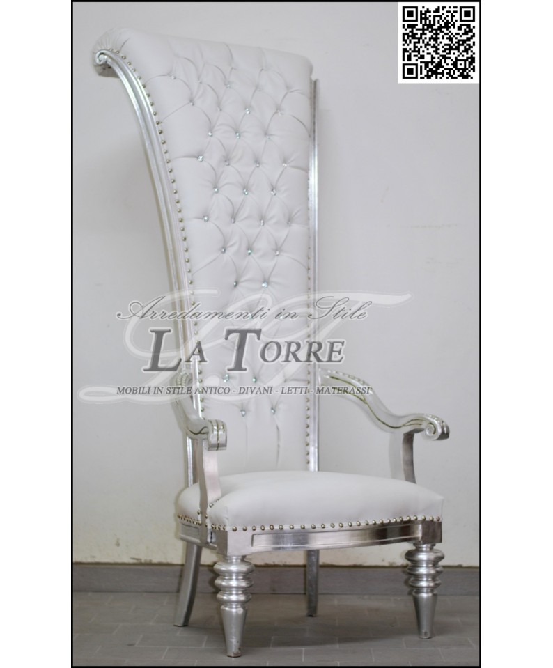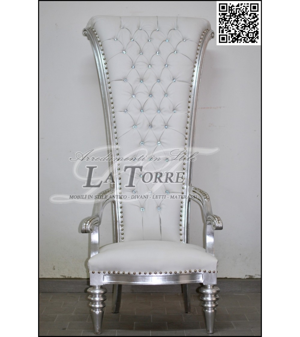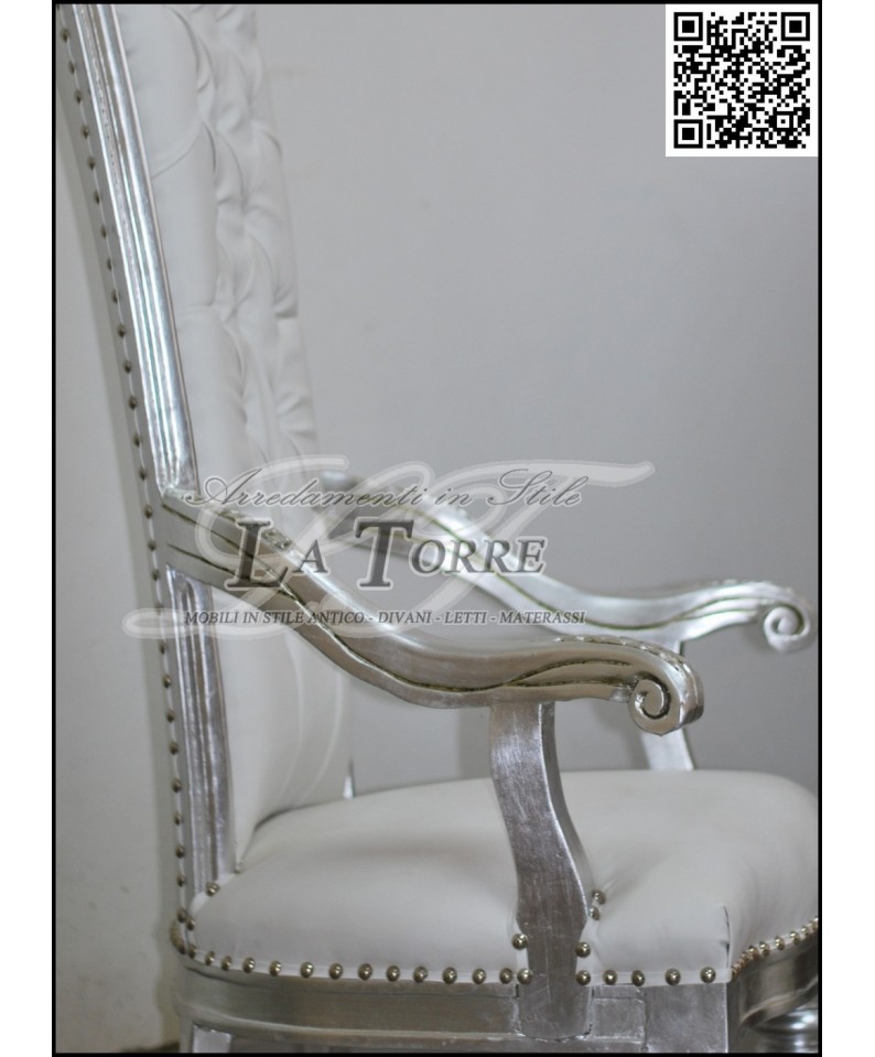 Poltrona trono Luigi XV barocco sedia h192 argento ecopelle bianca AL917