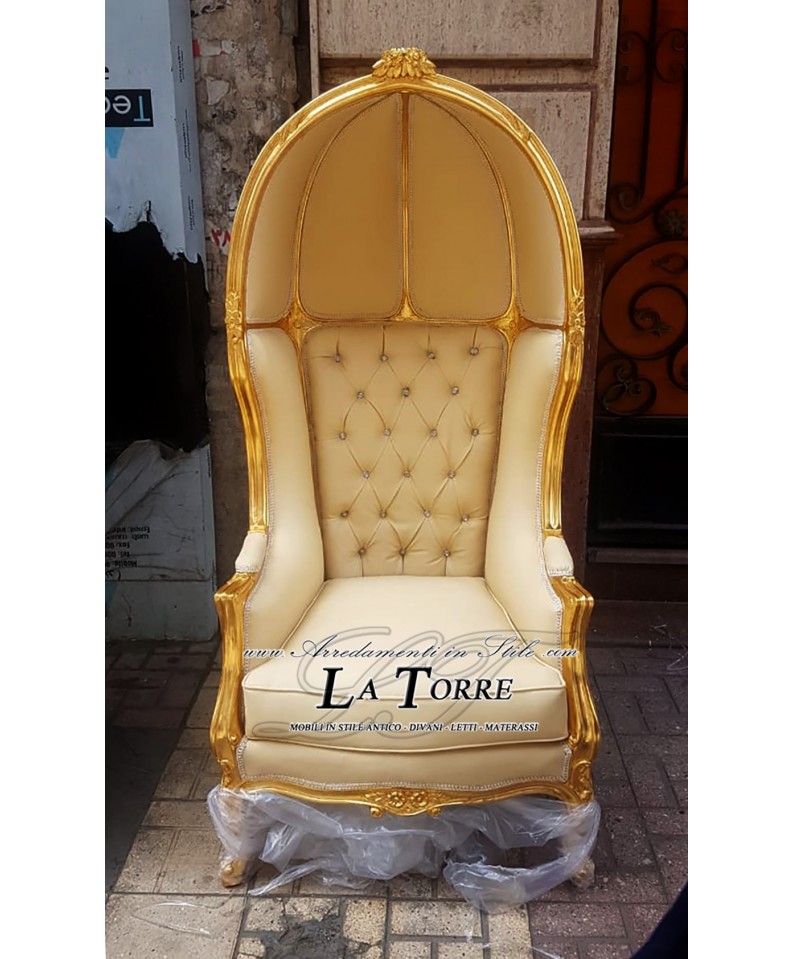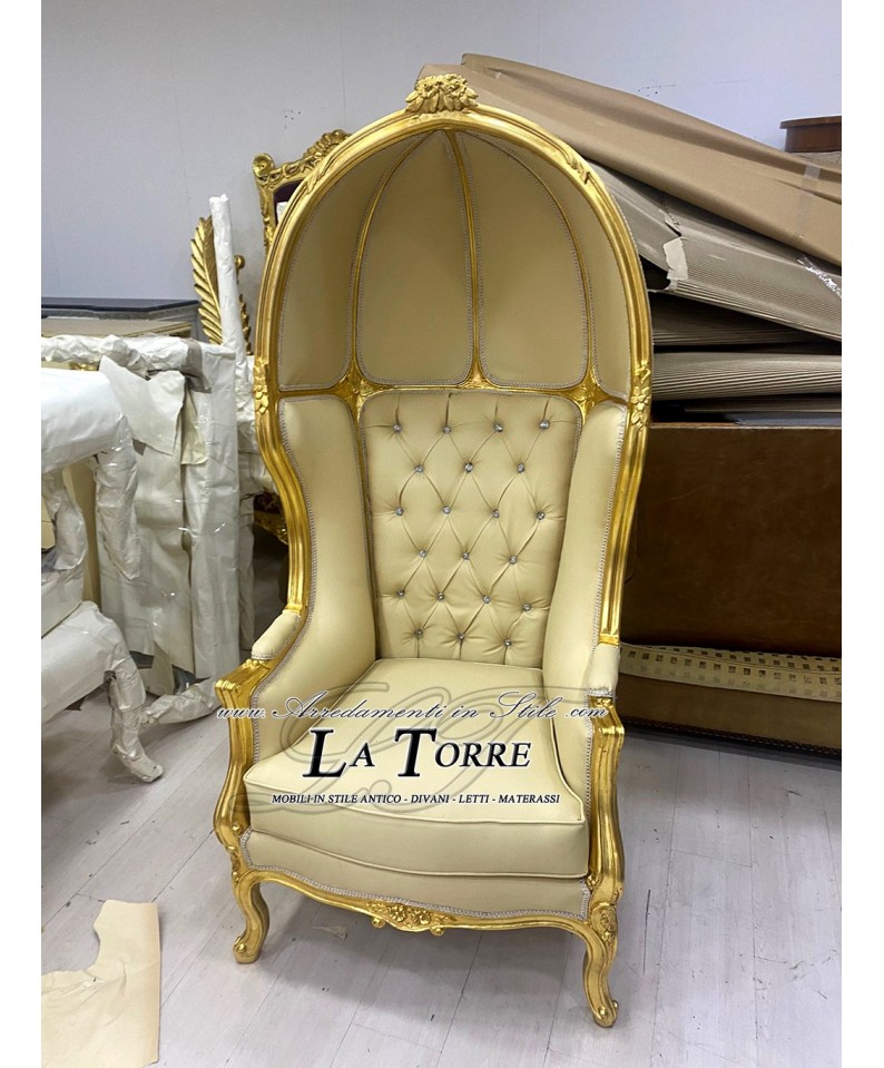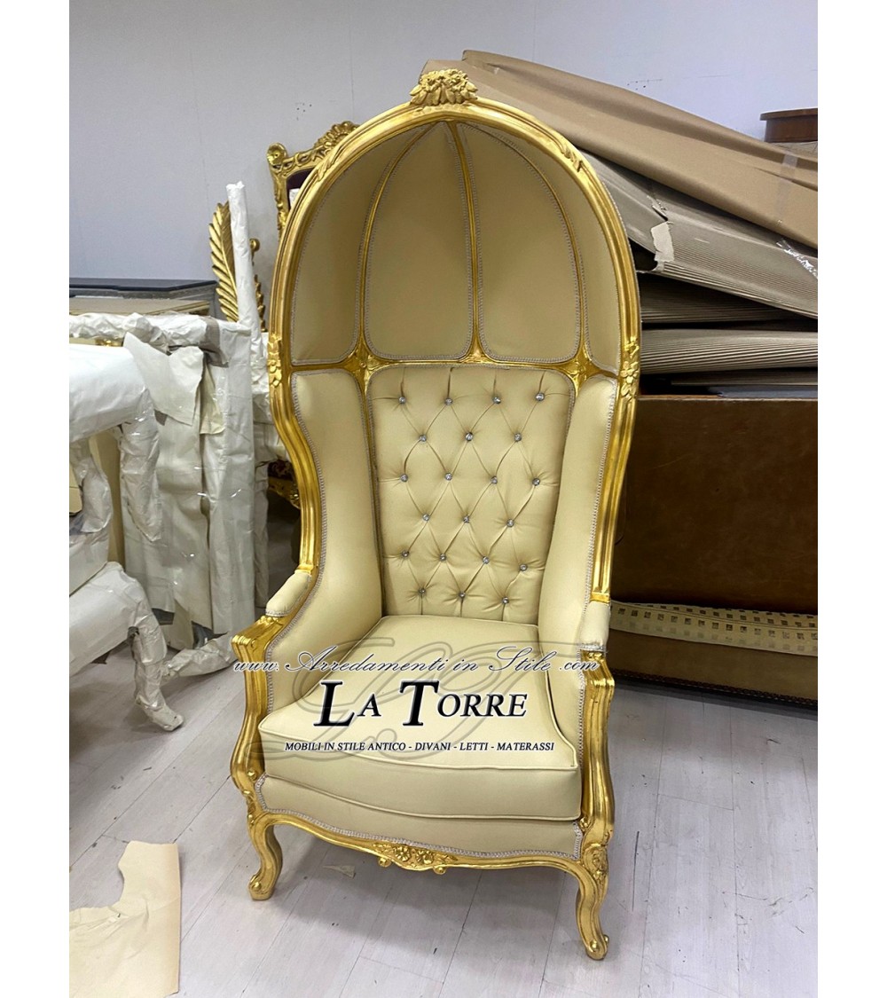 Poltrona Cupola divano Trono Barocco legno foglia oro ecopelle avorio Ar1556