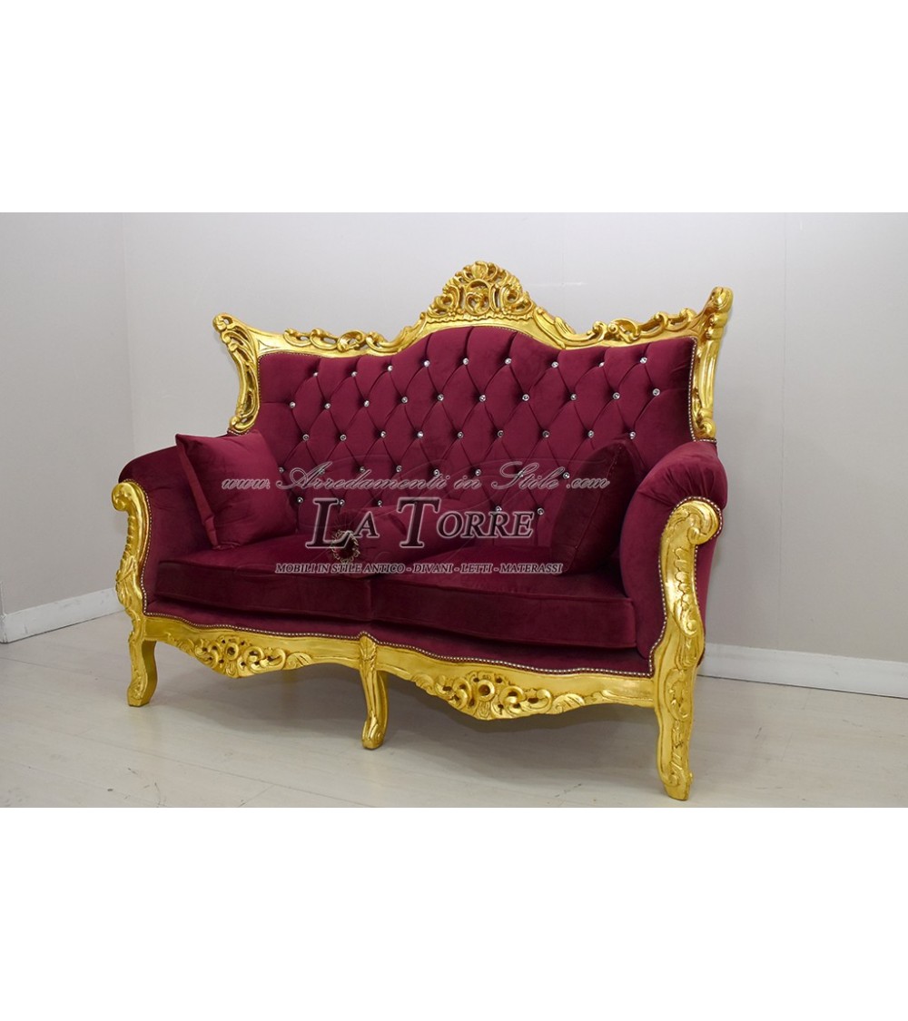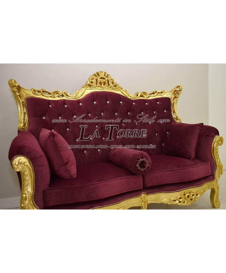 Poltrona Divano in stile barocco , con la struttura esterna del divano in legno, in foglia oro , che ne esalta ogni curva e intaglio. Il design è caratterizzato da intagli elaborati a ricciolo, motivi floreali e a conchiglia che adornano il bordo inferiore, le gambe, in particolare, la cimasa centrale dello schienale alto e avvolgente, dove si trova una grande applique dorata che funge da punto focale impreziositi da una lavorazione capitonné, con bottoni swarovski, aggiungendo profondità e un tocco di classica eleganza, con i due cuscini decorativi, interamente rivestiti da un lussuoso velluto di colore bordeaux.