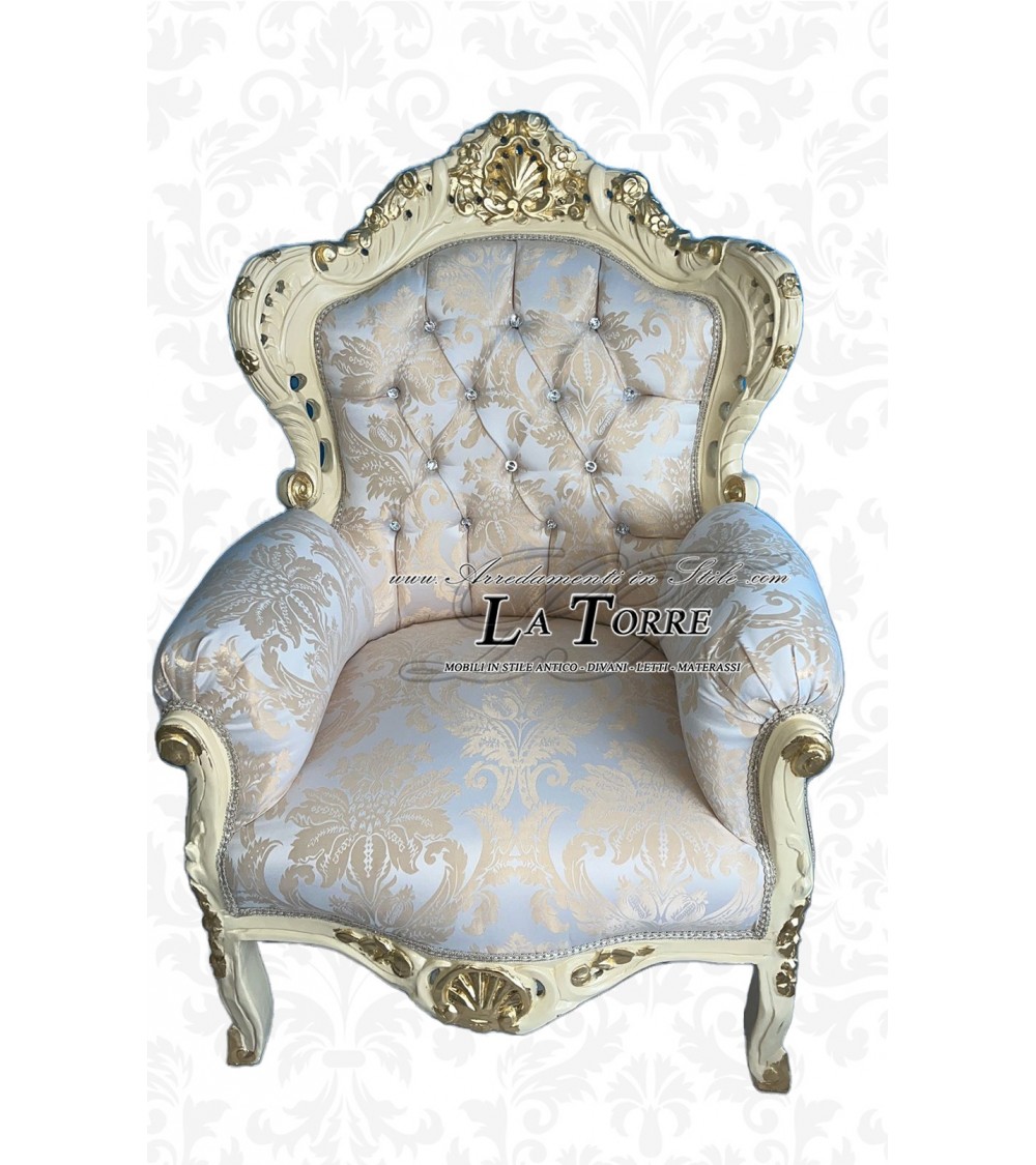 Sedia Poltrona Germany Trono Barocco avorio con particolari in foglia oro e tessuto damascato gigliato AL4227