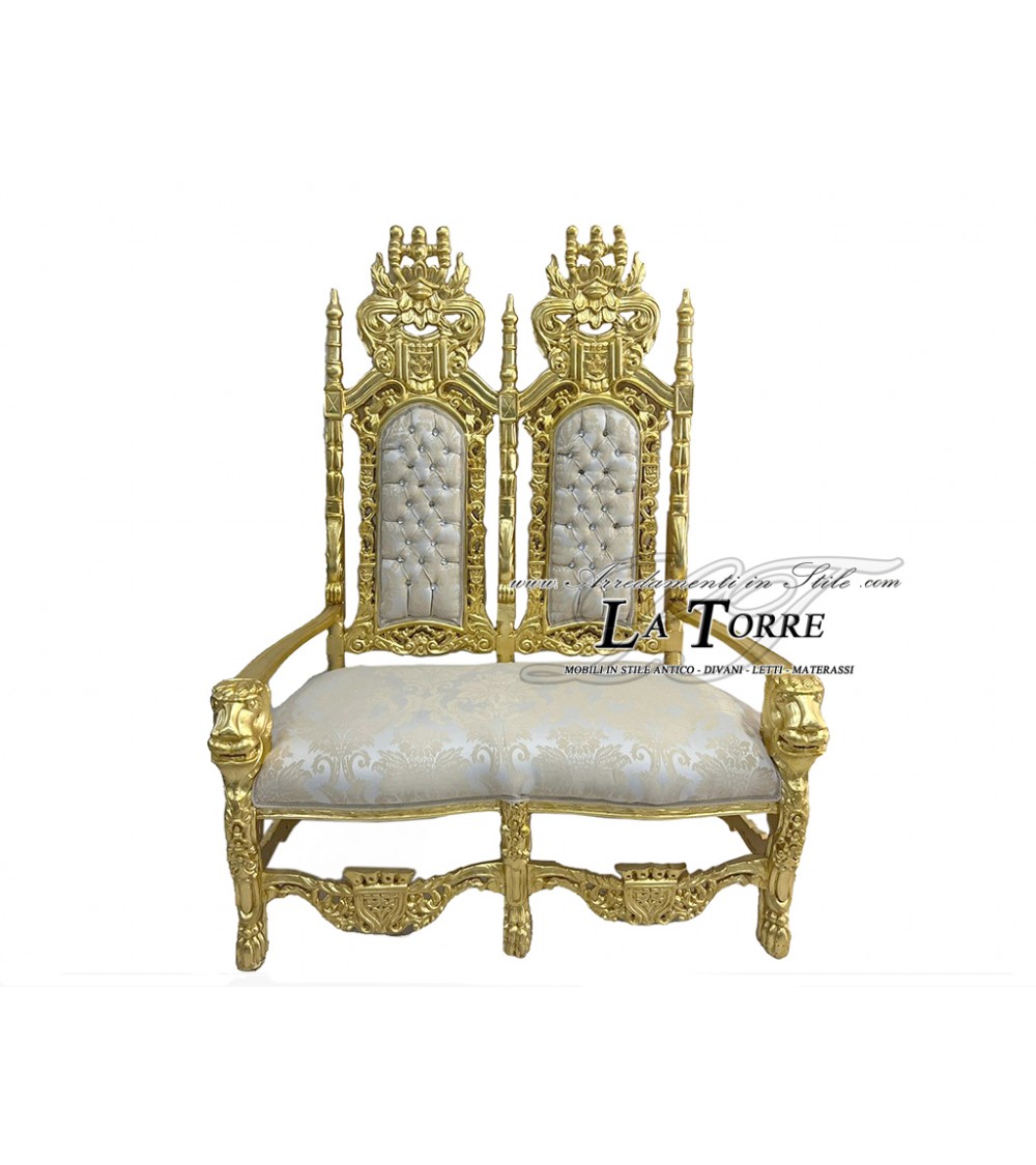 Trono da re due posti con leoni in stile barocco realizzata in legno, ricoperta da una ricca e brillante doratura lucida. Il pezzo è caratterizzato da due schienali alti e distinti, ciascuno con una cimasa superiore riccamente intagliata a forma di corona stilizzata, volute e foglie d'acanto, tipiche dello stile sfarzoso. I montanti laterali degli schienali sono anch'essi profondamente intagliati. Le sezioni centrali degli schienali sono imbottite e rivestite in un lussuoso tessuto damascato giglio fiorentino avorio, con motivi floreali o a volute tono su tono. Ogni sezione è impreziosita da una profonda lavorazione capitonné, con bottoni rivestiti che creano un motivo trapuntato, aggiungendo profondità e un tocco di classica eleganza. I braccioli sono ampi e le loro estremità anteriori sono scolpite a forma di teste di leone. Ideale per creare un punto focale in un salone di lusso, una sala da ballo, una suite presidenziale, o per eventi e matrimoni che mirano a trasmettere grandezza e sfarzo regale.