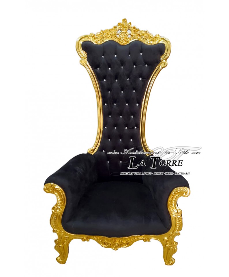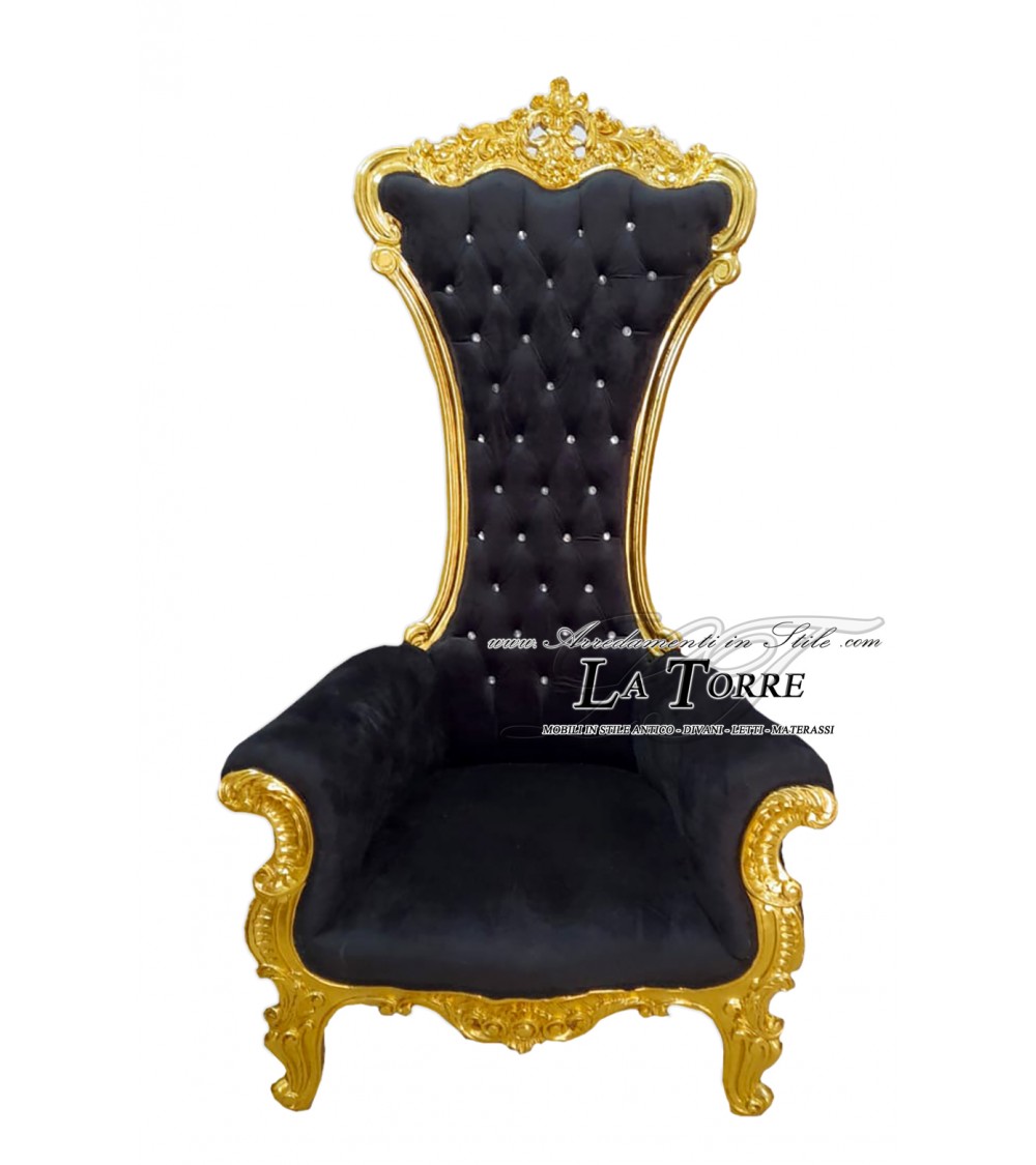 Trono Sedia Poltrona classico Barocco foglia oro tessuto velluto o ecopelle nero LT3048