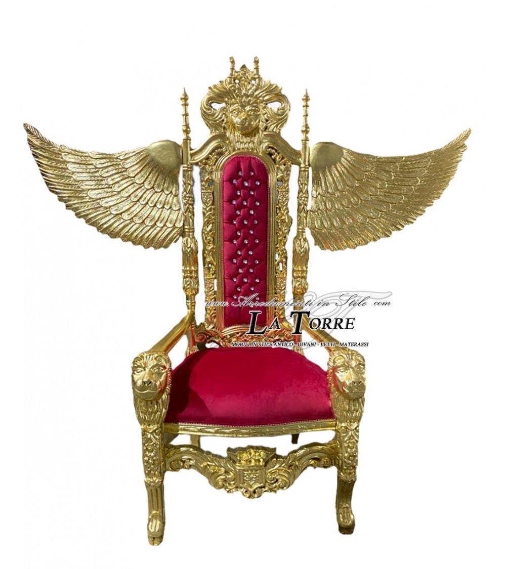 Trono da re con leoni alati in stile barocco interamente in legno, ricoperta da una ricca e brillante doratura lucida, che cattura la luce ed esalta ogni singolo intaglio. Lo schienale è altissimo e sagomato, con una cimasa superiore riccamente intagliata che presenta una testa di leone, sormontato da una corona, circondato da volute e foglie d'acanto. Ai lati dello schienale, si ergono due grandi e dettagliate ali .Il rivestimento è in velluto rosso, che crea un magnifico e drammatico contrasto con la doratura. La parte centrale dello schienale è impreziosita da una profonda e fitta lavorazione capitonné, con bottoni in swarovski. Ideale per creare un punto focale in un salone di lusso, una suite presidenziale, un ingresso di prestigio, o per eventi e ambienti che mirano a trasmettere grandezza e sfarzo regale.