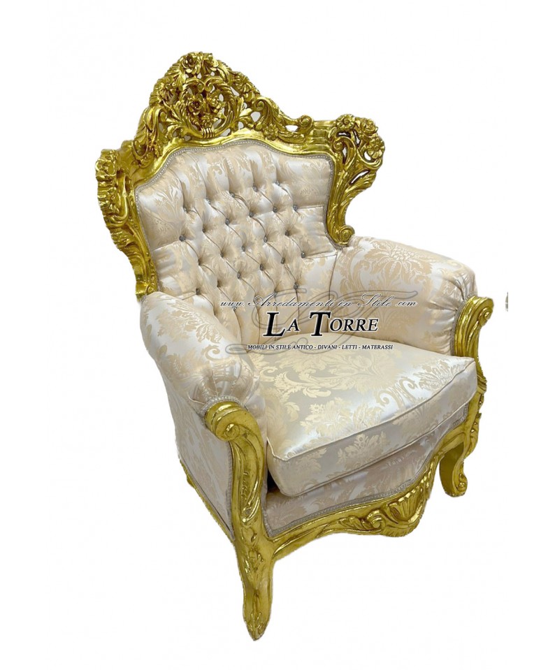 Poltrona singola si distingue per il suo design sontuoso e regale, ispirato allo stile barocco. La poltrona è interamente rivestita in un tessuto damascato gigliato , che aggiunge un tocco di lusso e calore alla stanza. La testiera alta e imponente, con la sua forma elaborata e sinuosa, è il punto focale del design. La testiera presenta una lavorazione capitonné con bottoni, che creano un motivo a rombi, aggiungendo un elemento di dettaglio e texture. I braccioli, leggermente arrotondati, contribuiscono a creare un'atmosfera accogliente e confortevole. La struttura della poltrona è realizzata in legno in foglia oro, con intagli elaborati che richiamano lo stile barocco. I piedini, anch'essi in legno dorati, presentano una forma leggermente curva, aggiungendo un ulteriore elemento di eleganza al design.