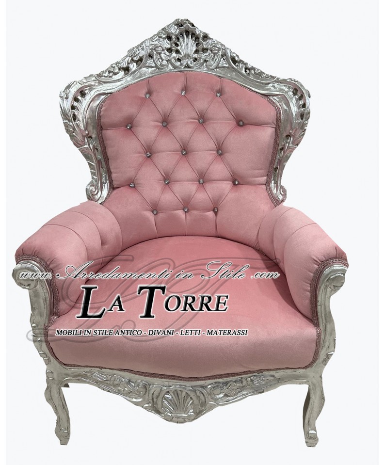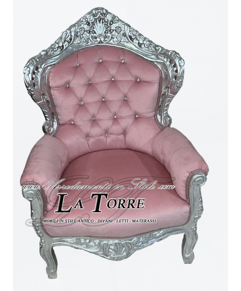 Poltrona singola si distingue per il suo design sontuoso e regale, ispirato allo stile barocco. La poltrona è interamente rivestita in un vellutino rosa , che aggiunge un tocco di lusso e calore alla stanza. La testiera alta e imponente, con la sua forma elaborata e sinuosa, è il punto focale del design. La testiera presenta una lavorazione capitonné con bottoni, che creano un motivo a rombi, aggiungendo un elemento di dettaglio e texture. I braccioli, leggermente arrotondati, contribuiscono a creare un'atmosfera accogliente e confortevole. La struttura della poltrona è realizzata in legno in foglia argento, con intagli elaborati che richiamano lo stile barocco. I piedini, anch'essi in legno argentati, presentano una forma leggermente curva, aggiungendo un ulteriore elemento di eleganza al design.