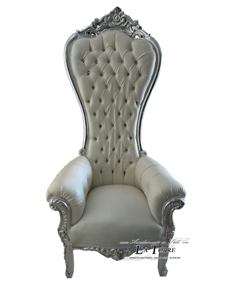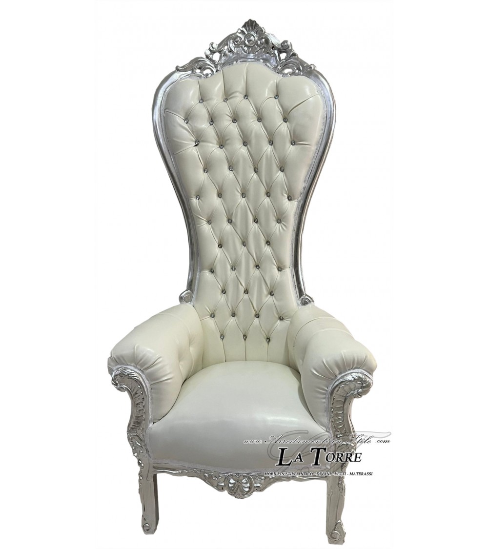 Poltrona trono stile Barocco ecopelle o vellutino bianca argento Swarovski Ar7579